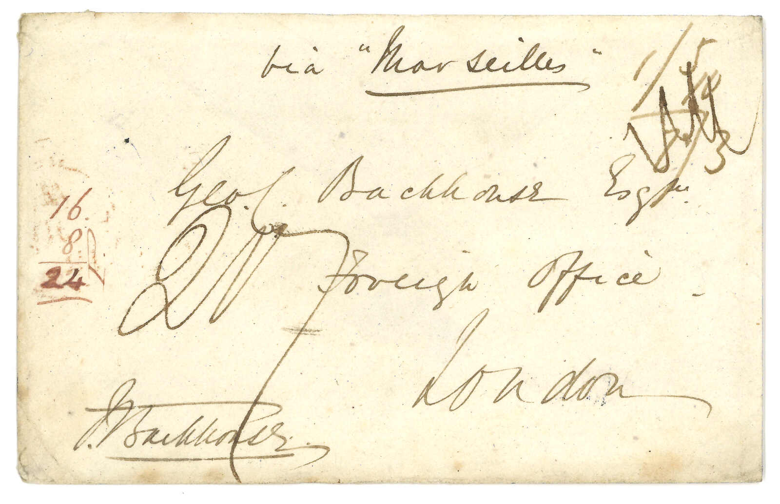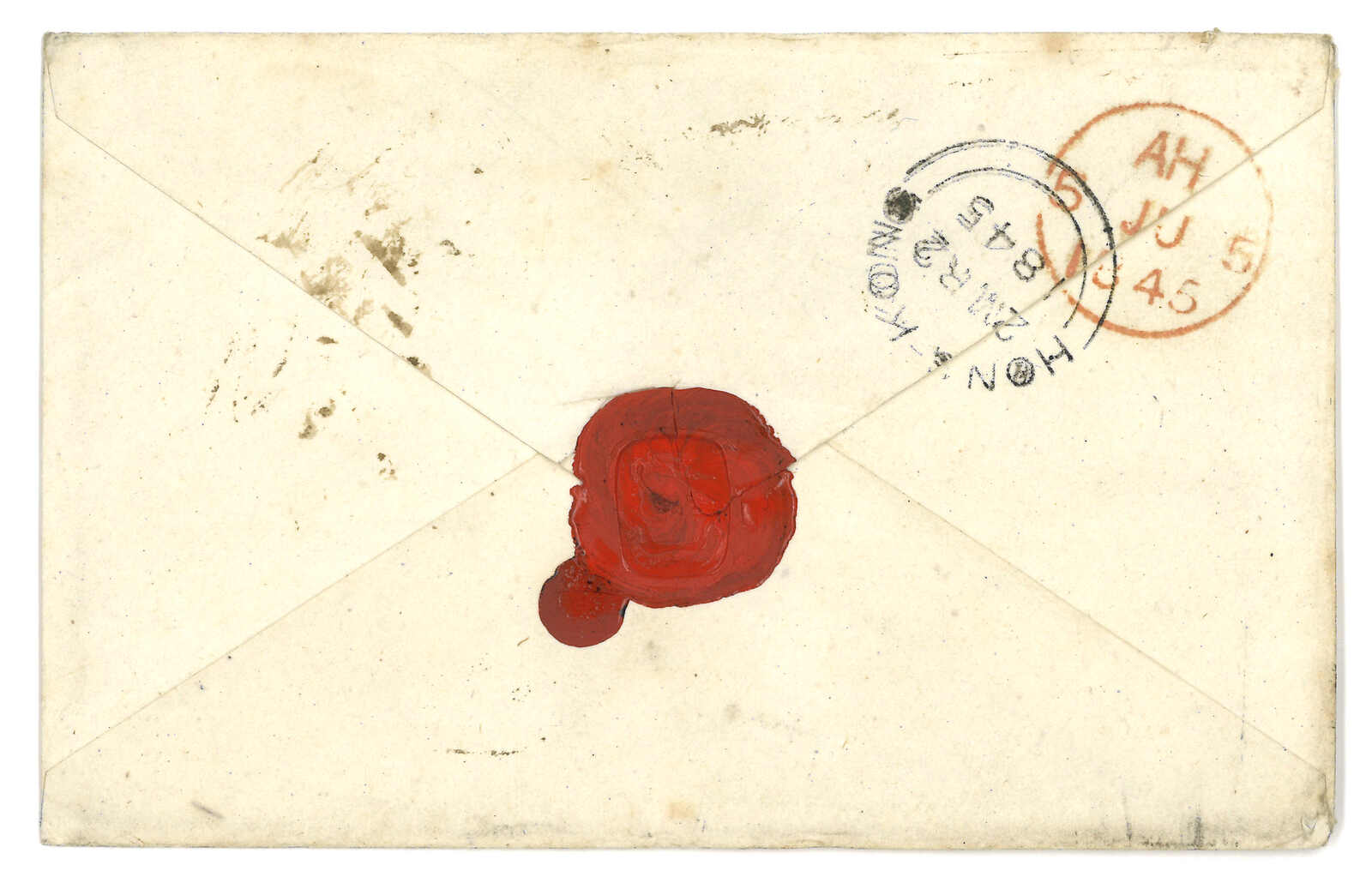 1838 cover imageOutgoing letter in the use of Indian Ship Letter Rate (from March to Sept 1845) 1845 (March 2), a good cover in 1/2 ounce sent from Hong Kong to England addressed to Foreign Office London, showing a very scarce 4-pence quarter ounce Indian Ship Letter rate, which charged for only 7 months from March to Sept 1845. This special rate applied to letters carried by private ship between India and China in 1845 as announced by British Post Office (please refer to Mr. D.L. Davies in HK Study Circle Journal 269 for further details related to the subject of Indian Ship Letter rate). On the reverse, cancelled by HK despatch c.d.s. (2 Mar), and arrival c.d.s. in London (5 June). The letter was carried by “Anonyma” to Bombay (20 Apr) and then the first voyage of the private ship “Queen” from Bombay to Aden (11 May) across Indian sea. On the obverse, in the upper right-hand corner, a set of manuscript rate marks “1(s)/5(d) plus 10(d) = 2(s)/3(d)” was deleted. A new manuscript rate of “2(s)/7(d)” written in the middle of the cover. Since the 4d Red Seas Ship Letter Rate was newly implemented in March 1845, the above first rate mark of “2/3” was then crossed out and amended to pay “2/7” by adding the newly implemented 4d Red Seas Ship Letter rate. Believed to be the earliest outgoing cover carrying the very short usage of 4d Indian Ship rate to private ship letter. Ex- Peter Shek.(Image 1) (Image 2)