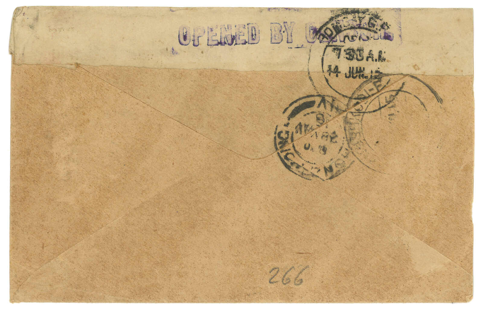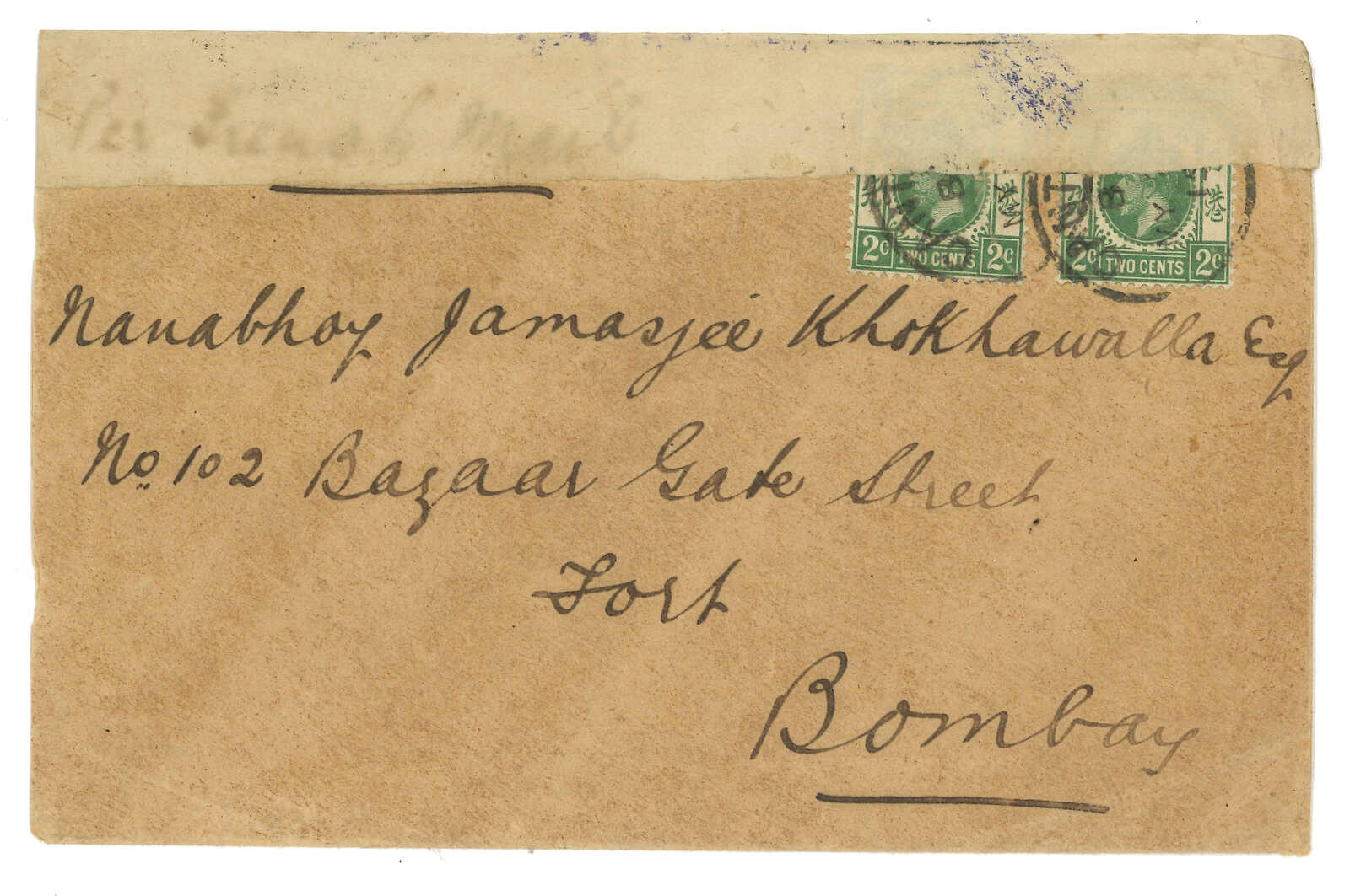 1875 cover image1917 Canton (May) to India. WWI censor cover, f.w. Hong Kong KGV 2c x2, tied by Canton BPO cds. Transit Hong Kong (28 May). Censored and resealed Arrived India (14 Jun).