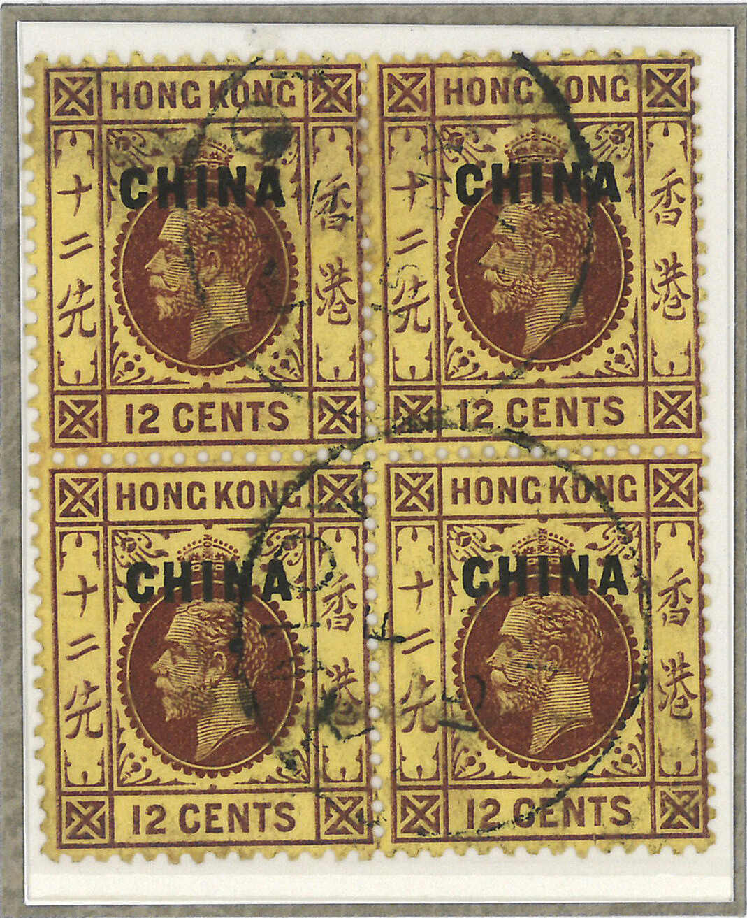 香港佐治五世加蓋CHINA 12仙四方連,銷廈門英局Jiv型(F字) 日 戳。B字、E字及F字在J型日戳上均少見,但F字最為難得。(Image 1) (Image 2) (Image 3)