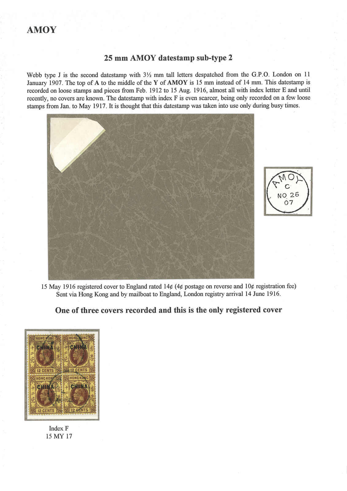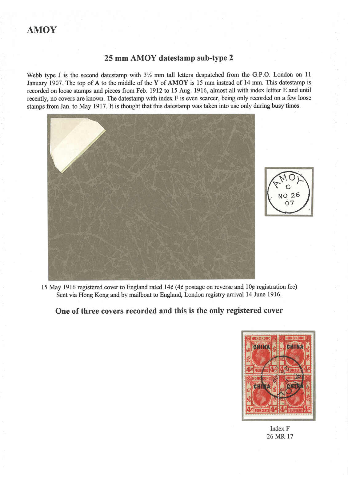 2267 imageHong Kong KGV ovpt. CHINA 12c in block of 4, tied by Amoy BPO Webb type Jiv (index F) cds. Index B, E and F are all scarce on type J cds but index F are the rarest.