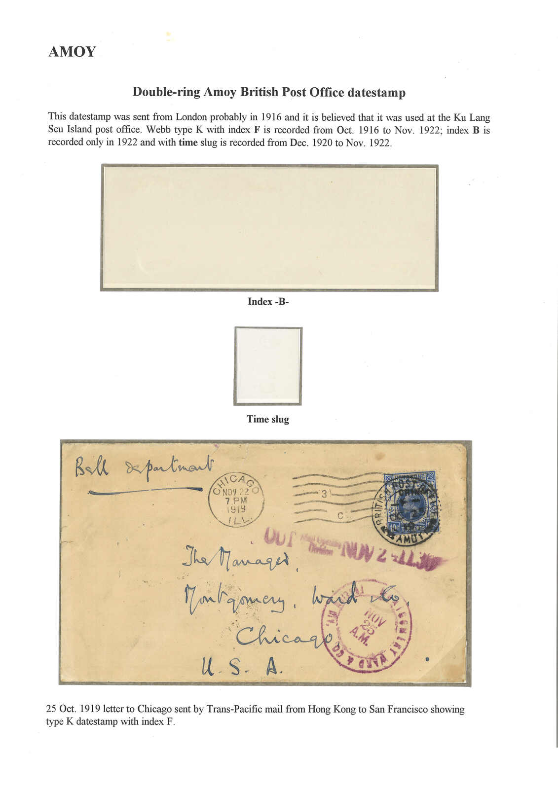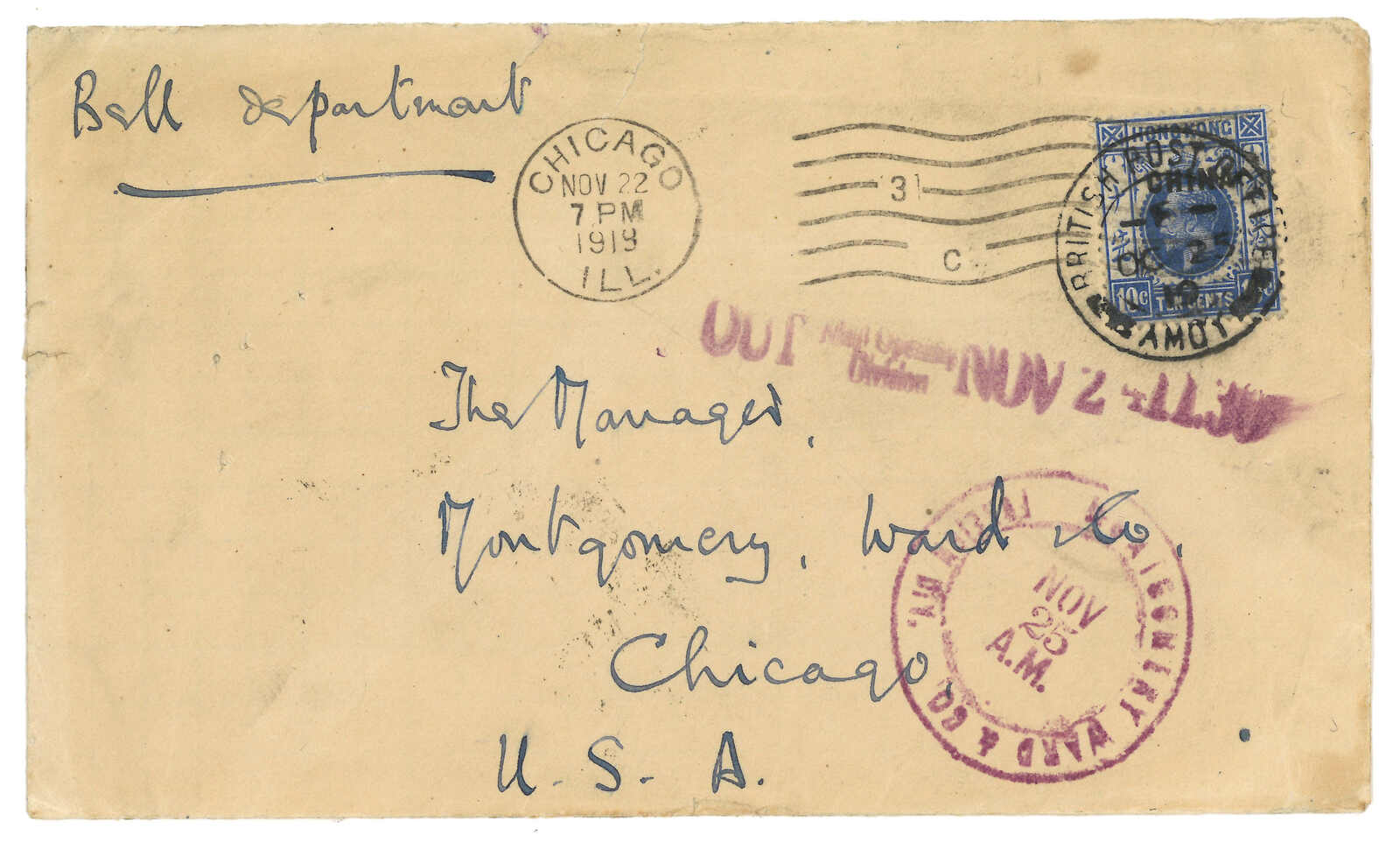 1919.10.25 廈門寄美國,貼香港佐治五世加蓋CHINA 10仙,銷 廈門英局Webb Ki型F字日戳。10.17經香港。11.22抵芝加哥。(Image 1) (Image 2) (Image 3)