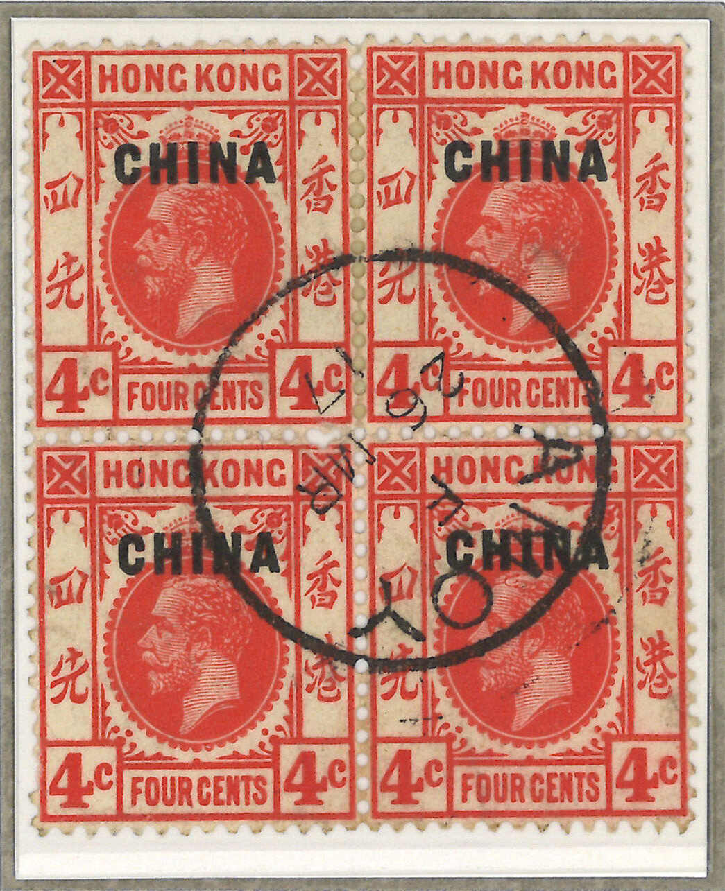 香港佐治五世加蓋CHINA 4仙四方連,銷廈門英局Jiv型(F字) 日戳。B字、E字及F字在J型日戳上均少見,但F字最為難得。(Image 1) (Image 2) (Image 3)