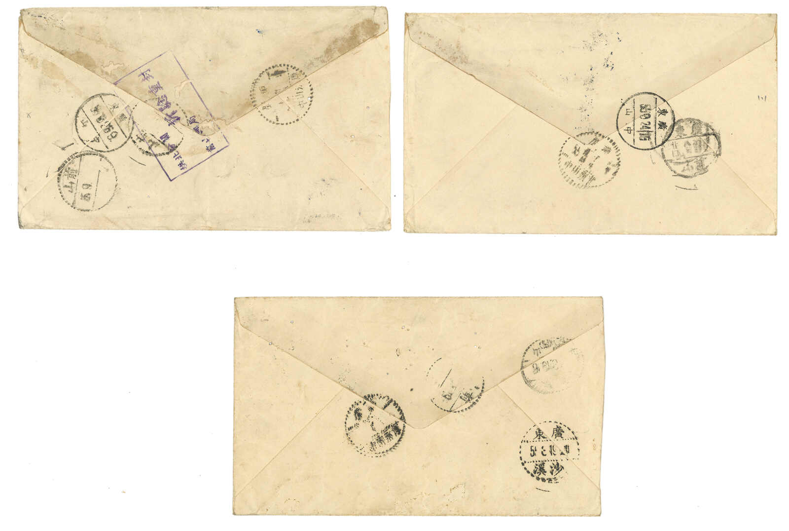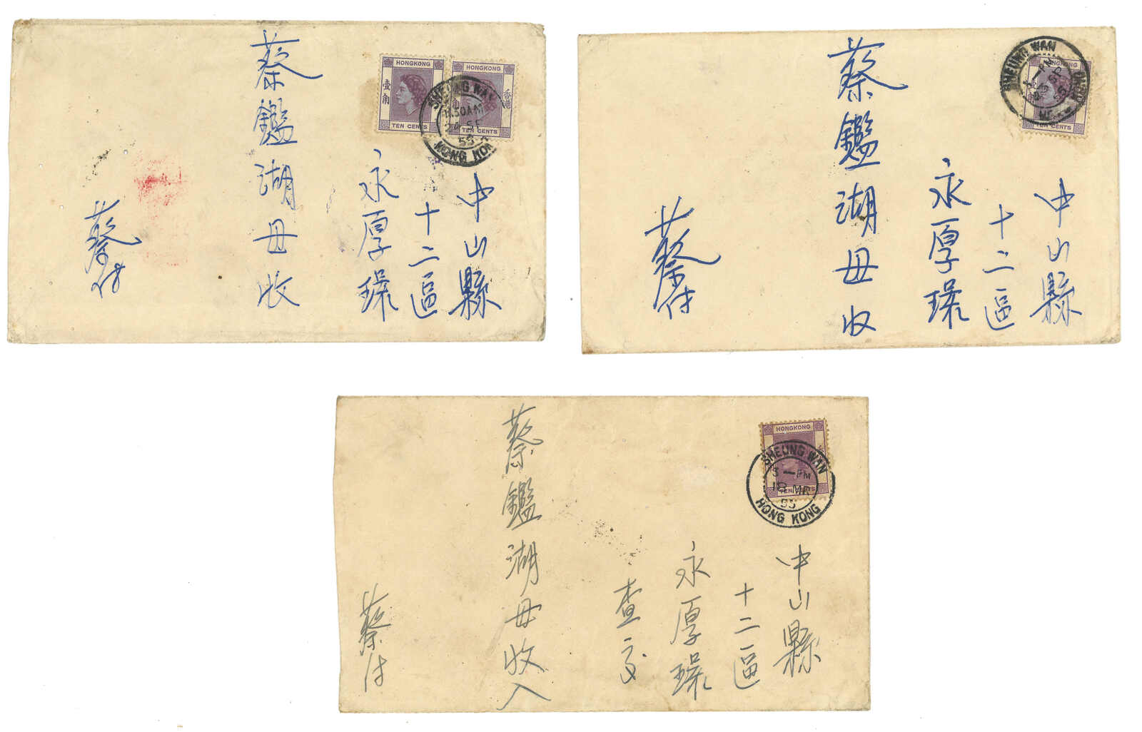 1955年一組三件香港寄中山縣封,地址相地,貼香港伊麗莎白二世10仙,銷上環日戳。背面蓋有前山、沙溪以及中山地名日戳。當中一件蓋有“拱北分關 / 前山郵局”檢查重封章。(Image 1) (Image 2)