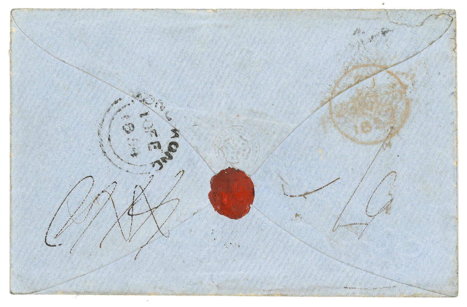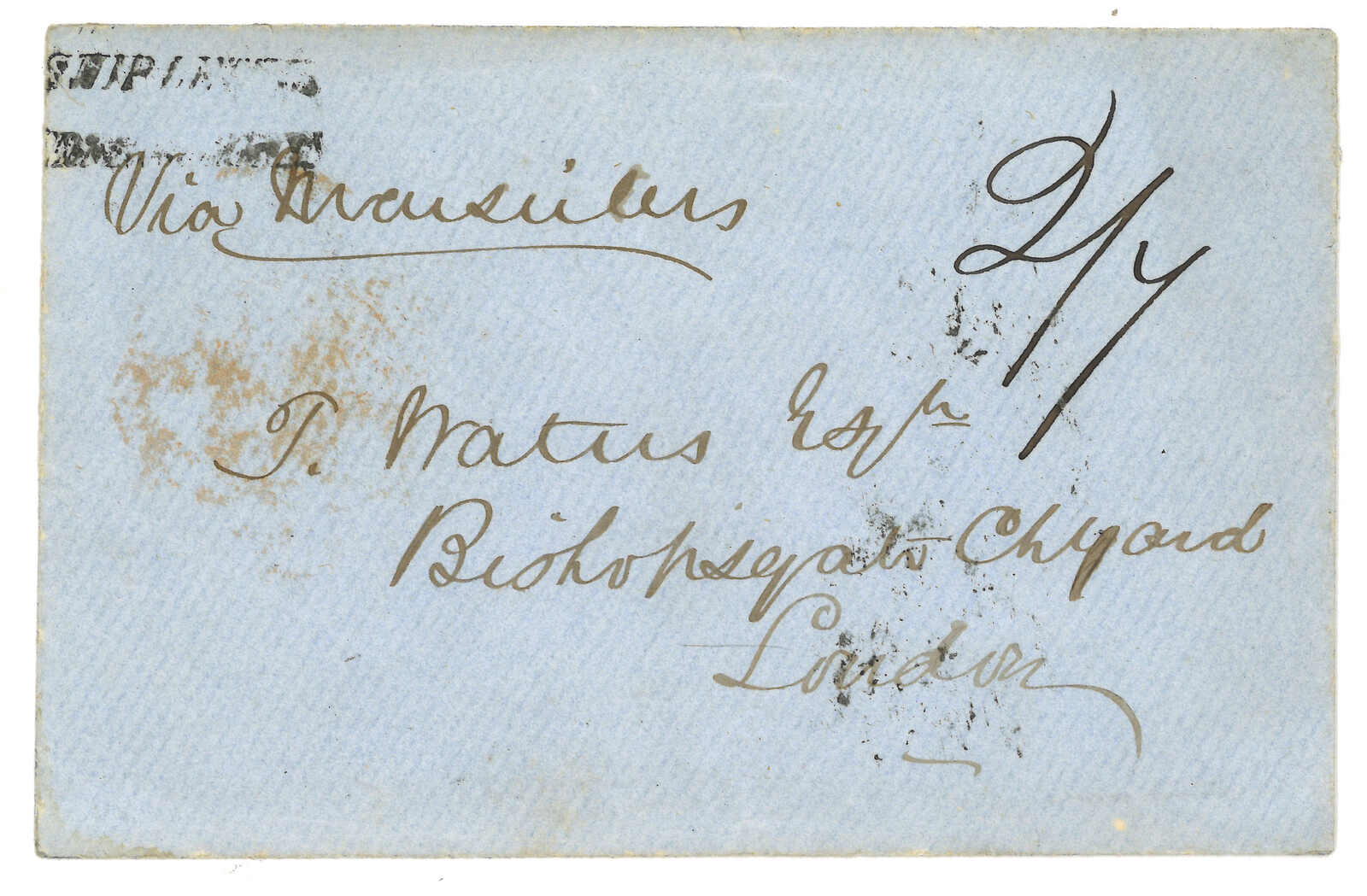 2006 cover image1854 Hong Kong (10 Feb) to England. Entire letter, sent “Via Marseilles” and rated “2/7”, applied with scarce “SHIPLETTER / VICTORIA HONGKONG” cachet and Hong Kong double-arc cds. Arrived London (29 Mar). This cover was carried by Cadiz, Bengal and Valetta while is was the first return trip of Cadiz from Hong Kong to Galle.