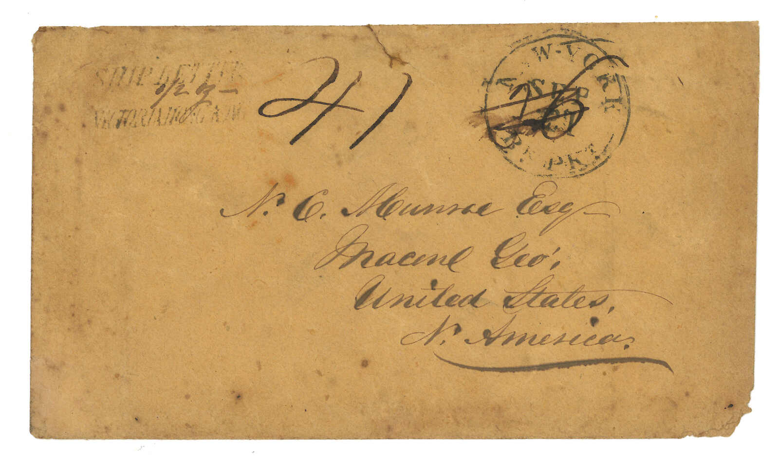 2007 cover image1854 Hong Kong (4 Jul) to USA, rated “26” but crossed out and changed to “41”, applied with scarce “SHIPLETTER / VICTORIA HONGKONG” cachet. On reverse with Hong Kong double-arc cds. Transit London (6 Sep). This letter was carried by Cadiz, Bengal and Ripon.