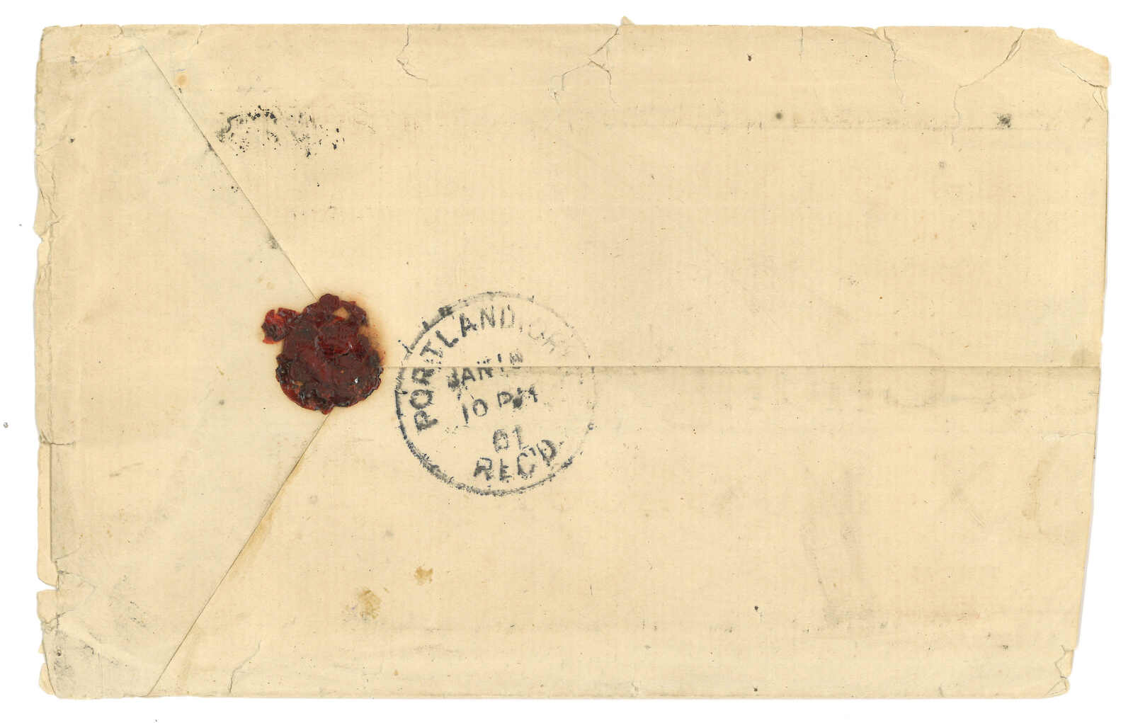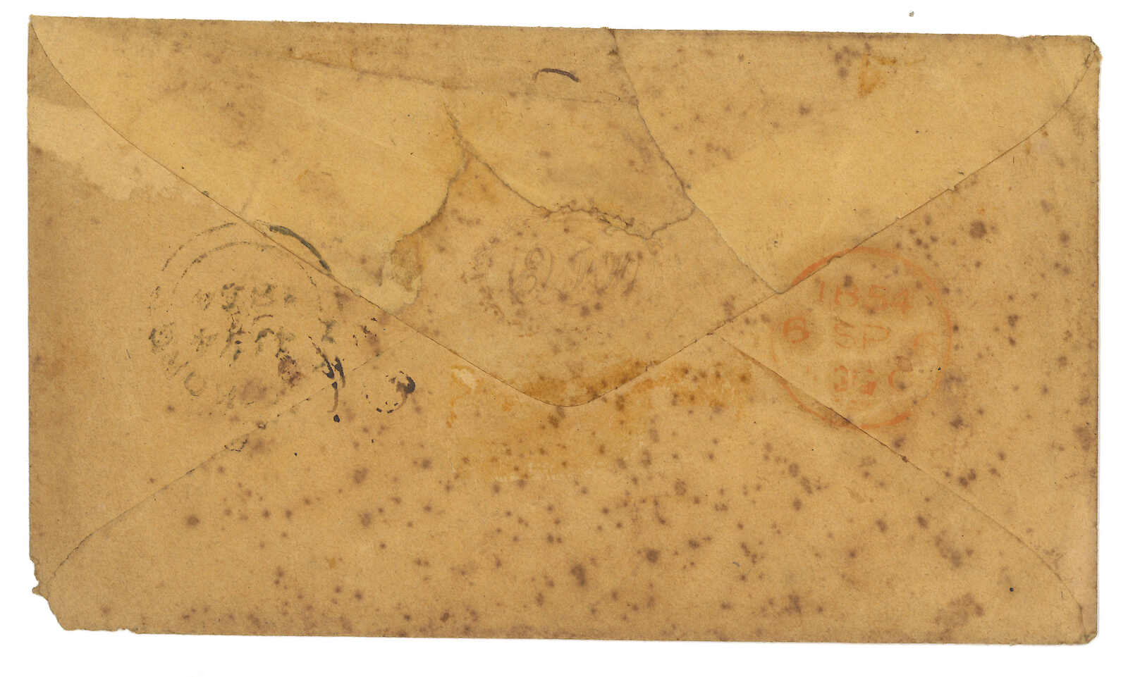 1854.7.4 香港寄美國,寫有郵資“26”但被劃去改作“41”,鈐少見之維多利亞船信戳,背面蓋有香港雙弧日戳。9.6經倫敦。此信經Cadiz、Bengal及Ripon號送遞。(Image 1) (Image 2)