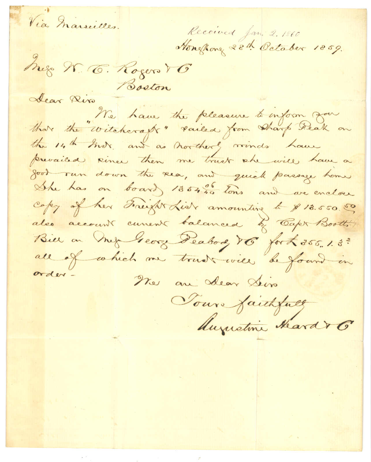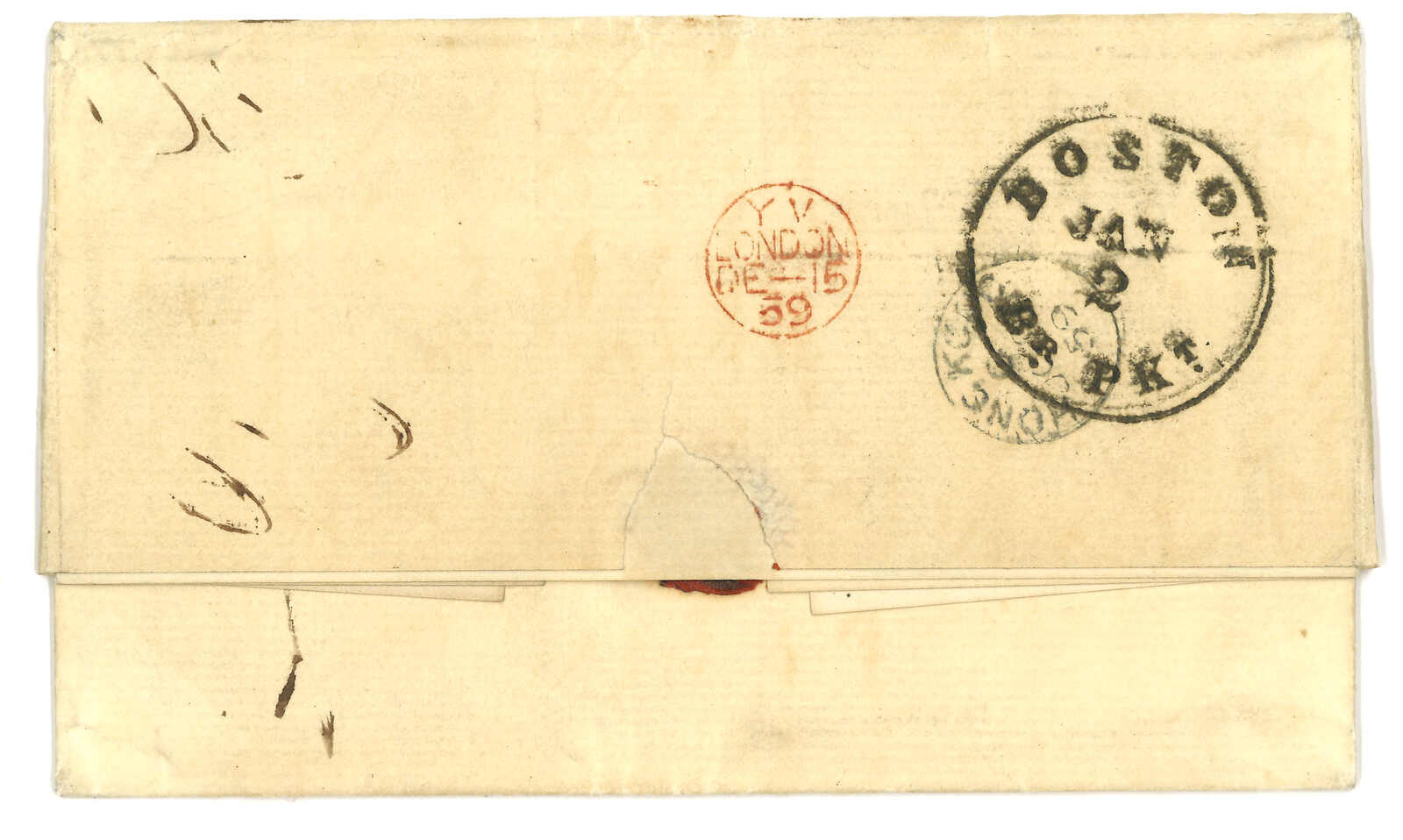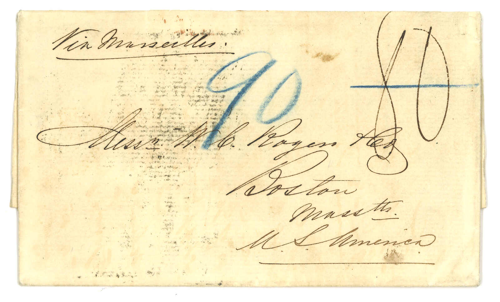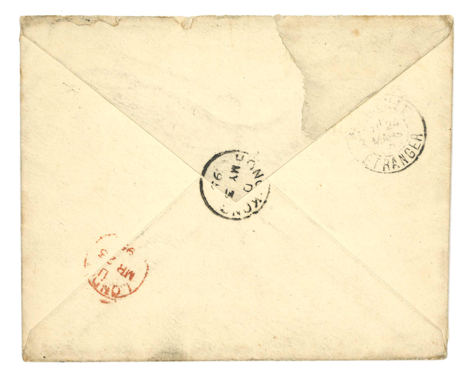 1859.10.28 香港瓊記洋行寄美國,寫有“via Marseilles”及郵資“80”,但劃去改作“90”,鈐香港日戳。12.15經倫敦。1.2抵波士頓。此封經Norna、Candia及Panther號送遞。(Image 1) (Image 2) (Image 3)