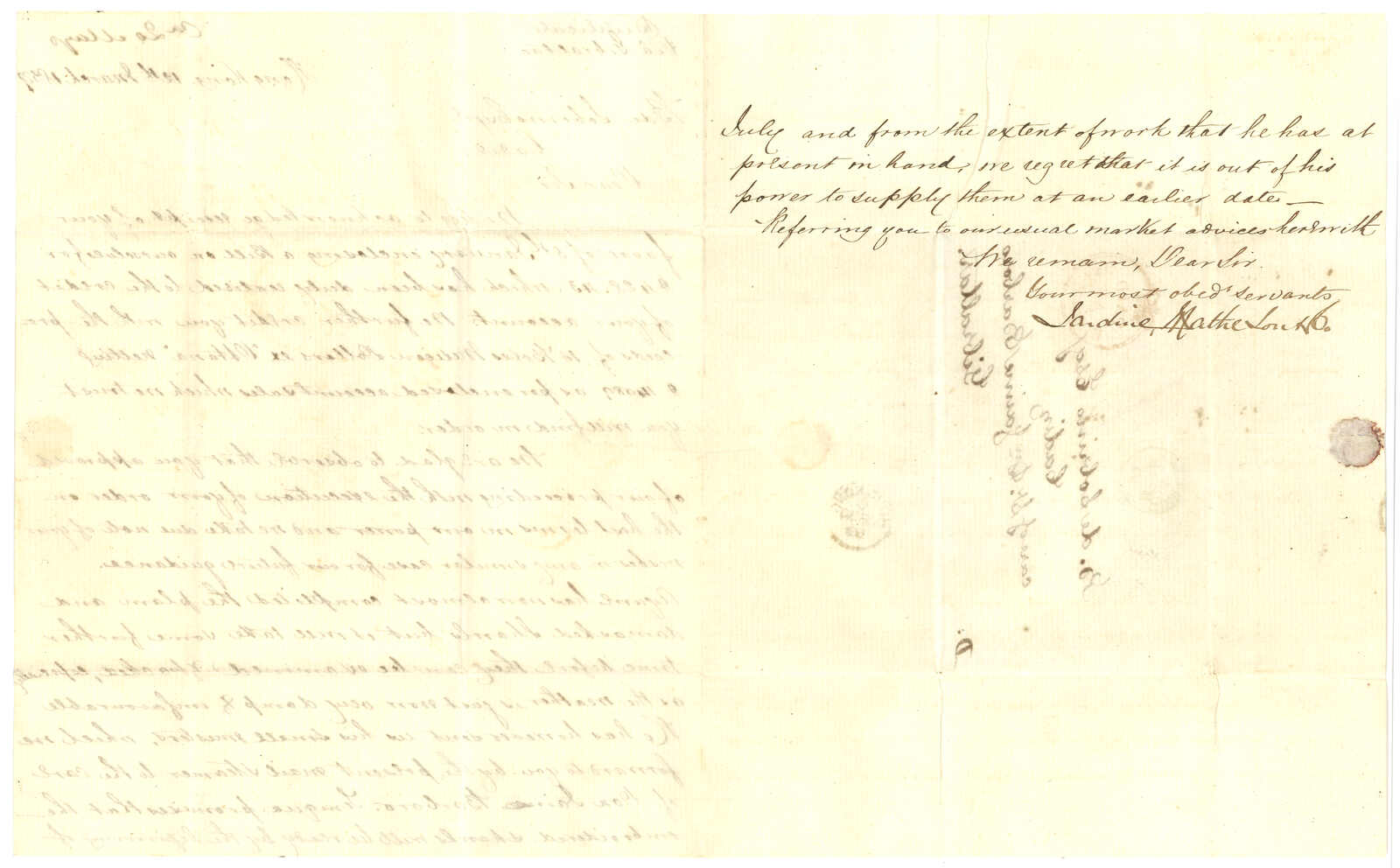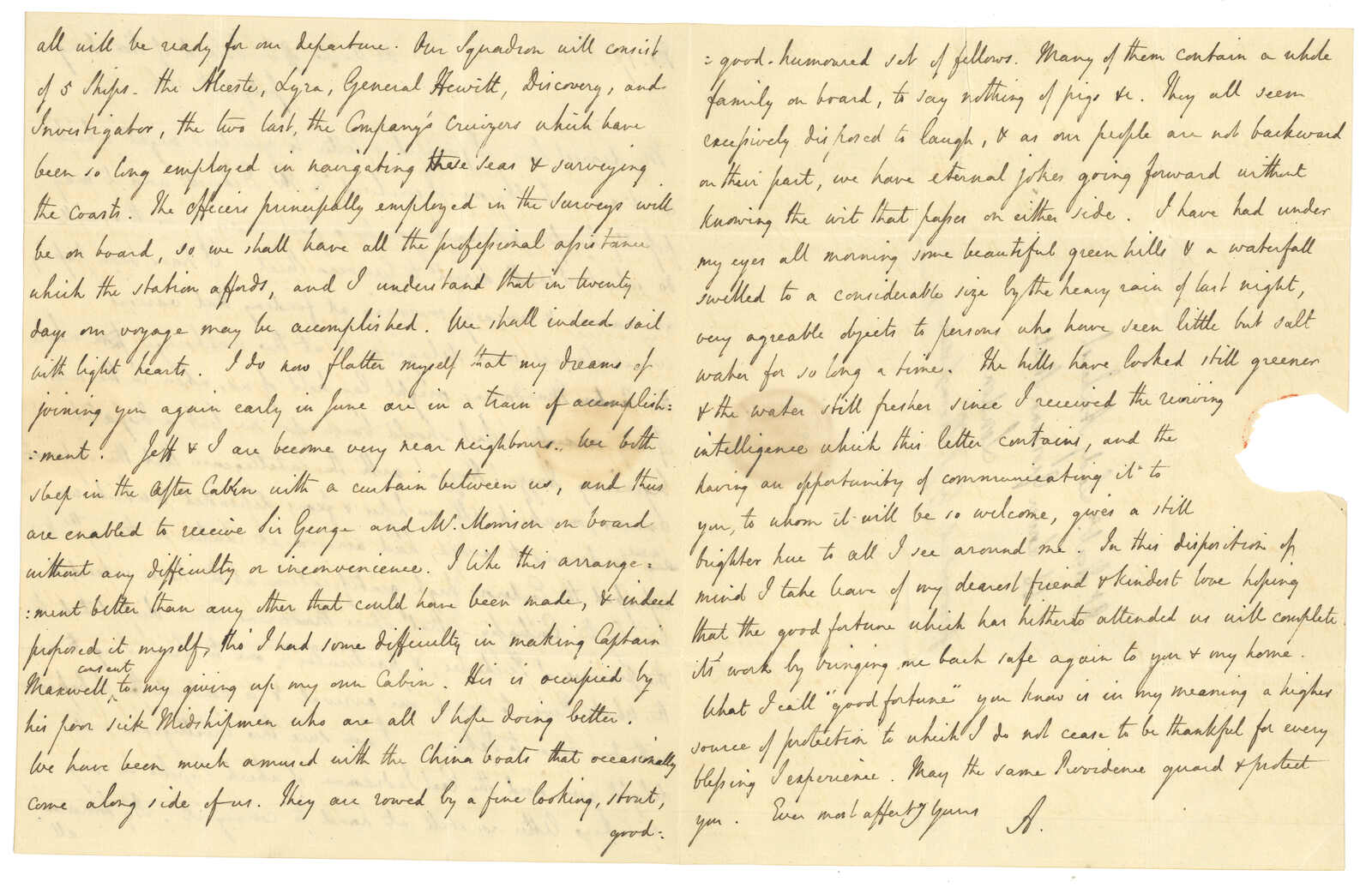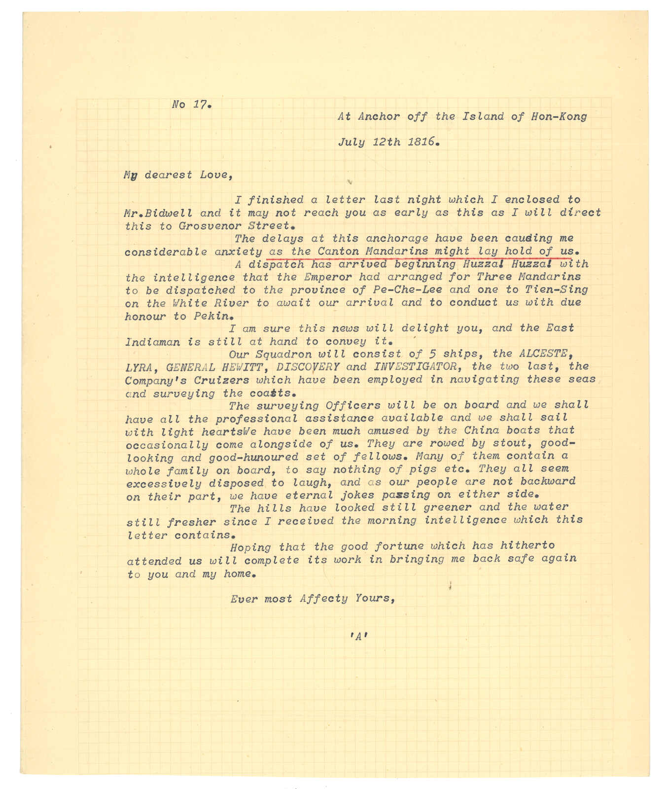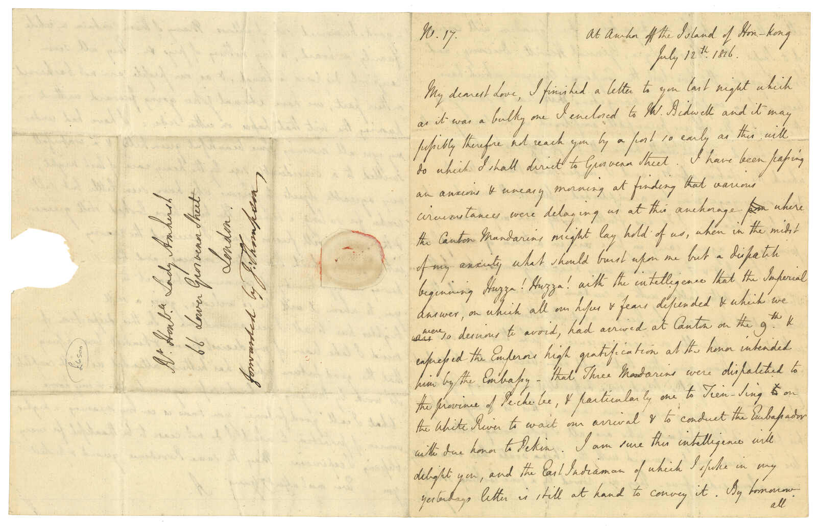 1816.7.12 由阿美士德勳爵於“香港島拋錨”寄倫敦的妻子。郵簡,背面火漆被移除。內容提及其船隻拋錨日期較晚,使其害怕廣州的官員會對他諸多留難。另外提到“皇帝已安排官員於天津等待其到來,以便安排進京。附英文謄寫抄本。 1816年,英國政府派阿美士德勳爵出使訪華,以圖與清廷商討中、英貿易事宜。然而阿美士德使團與清廷就三跪九叩禮問題出現分歧。阿美士德使團的任務最終失敗,沒法與清廷討論貿易問題,更使英商的走私活動在1820年代與日俱增,為鴉片戰爭埋下伏筆。 此封歷史意義超凡卓絕,更可能為出自香港之最早郵件。(Image 1) (Image 2) (Image 3)