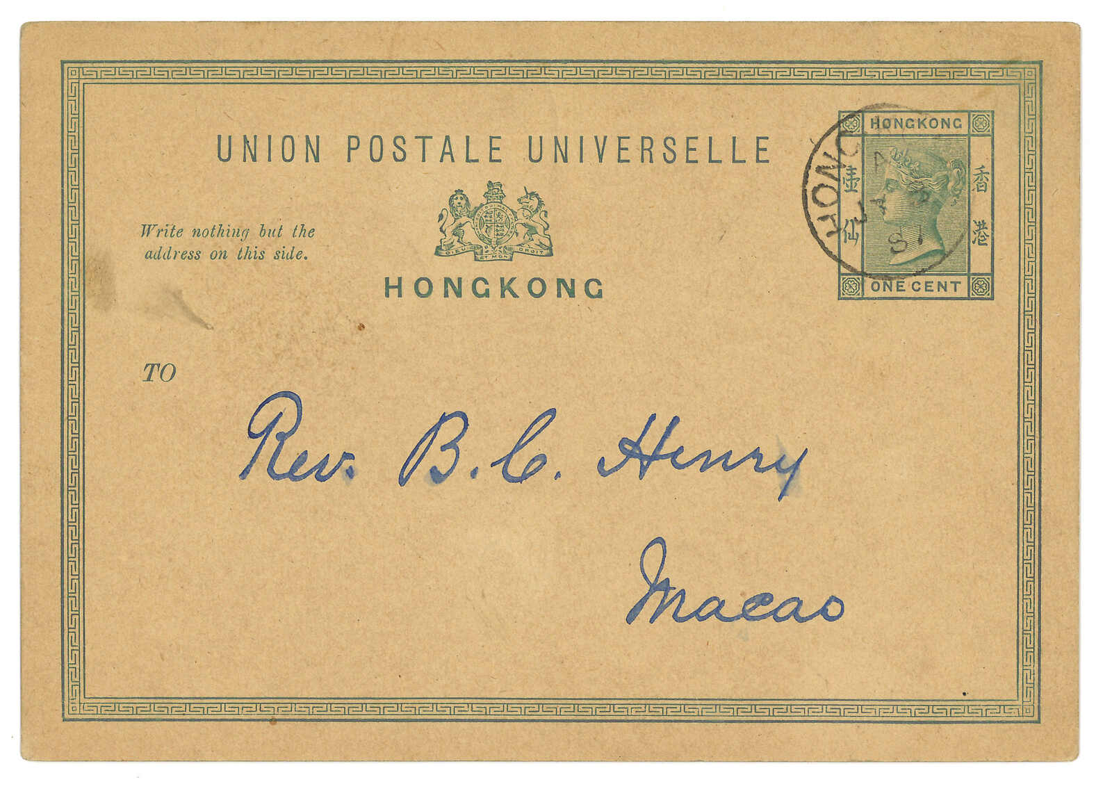 1887.7.8 香港寄澳門。香港維多利亞女皇像1仙郵資片,銷香港A字日戳。7.8抵澳門,鈐雙圈無皇冠日戳。(Image 1) (Image 2)