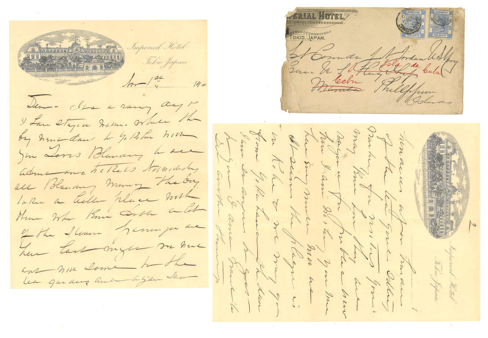 1900.11.15 香港寄馬尼拉美國海軍軍官Jordan,貼香港維多利亞女皇像10仙x2,銷香港E字日戳(倒月份變異)。11.22抵馬尼拉。 附原信,印有東京帝國酒店抬頭。封左側打開。(Image 1) (Image 2)