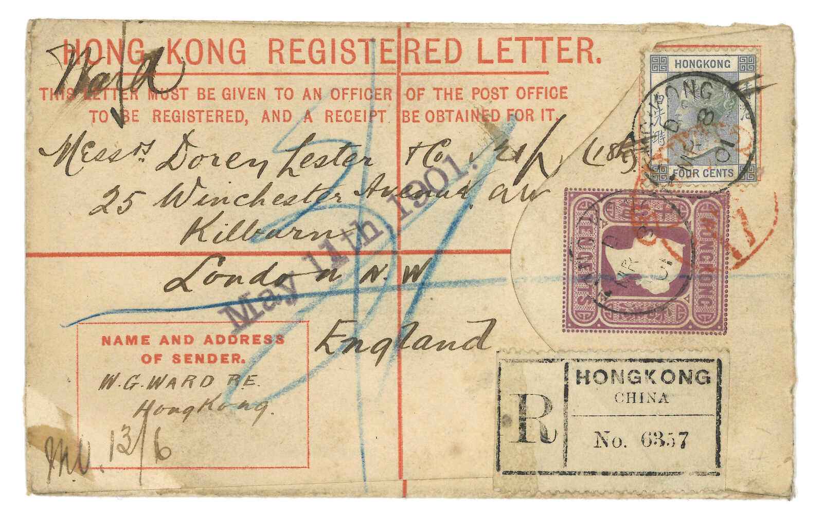 2039 cover image1901 (8 Mar) Hong Kong QV 10c registered stationery cover (size F 3-1/4 x 5-1/4 inch) to England, uprated by 4c, tied by Hong Kong cds and London arrival cds, alongside with registered label.
