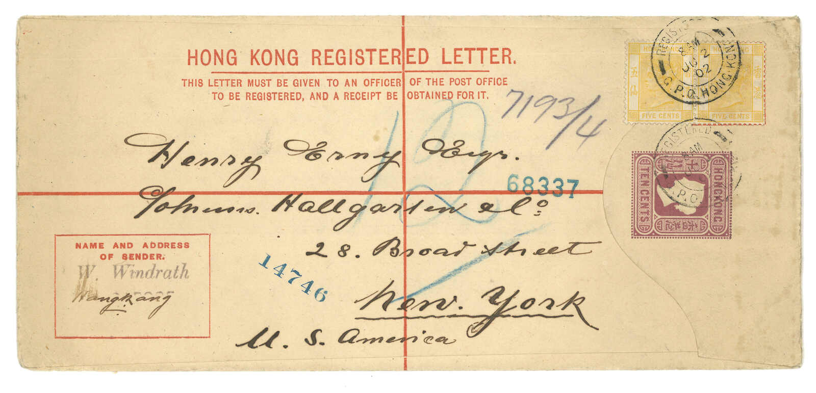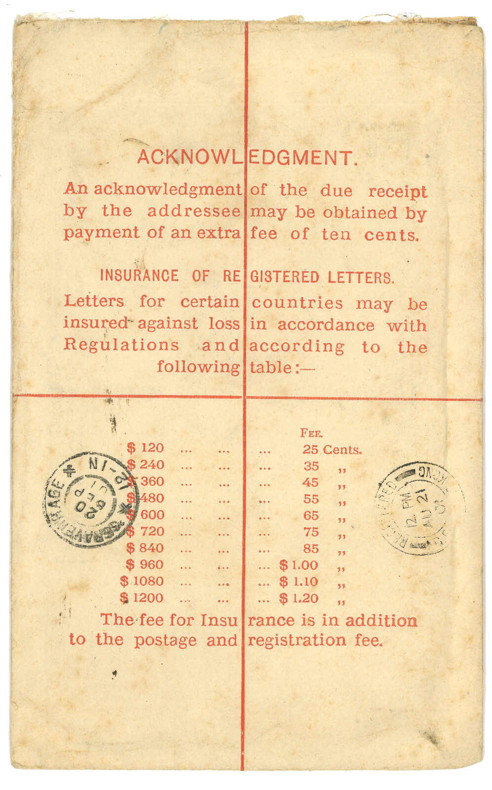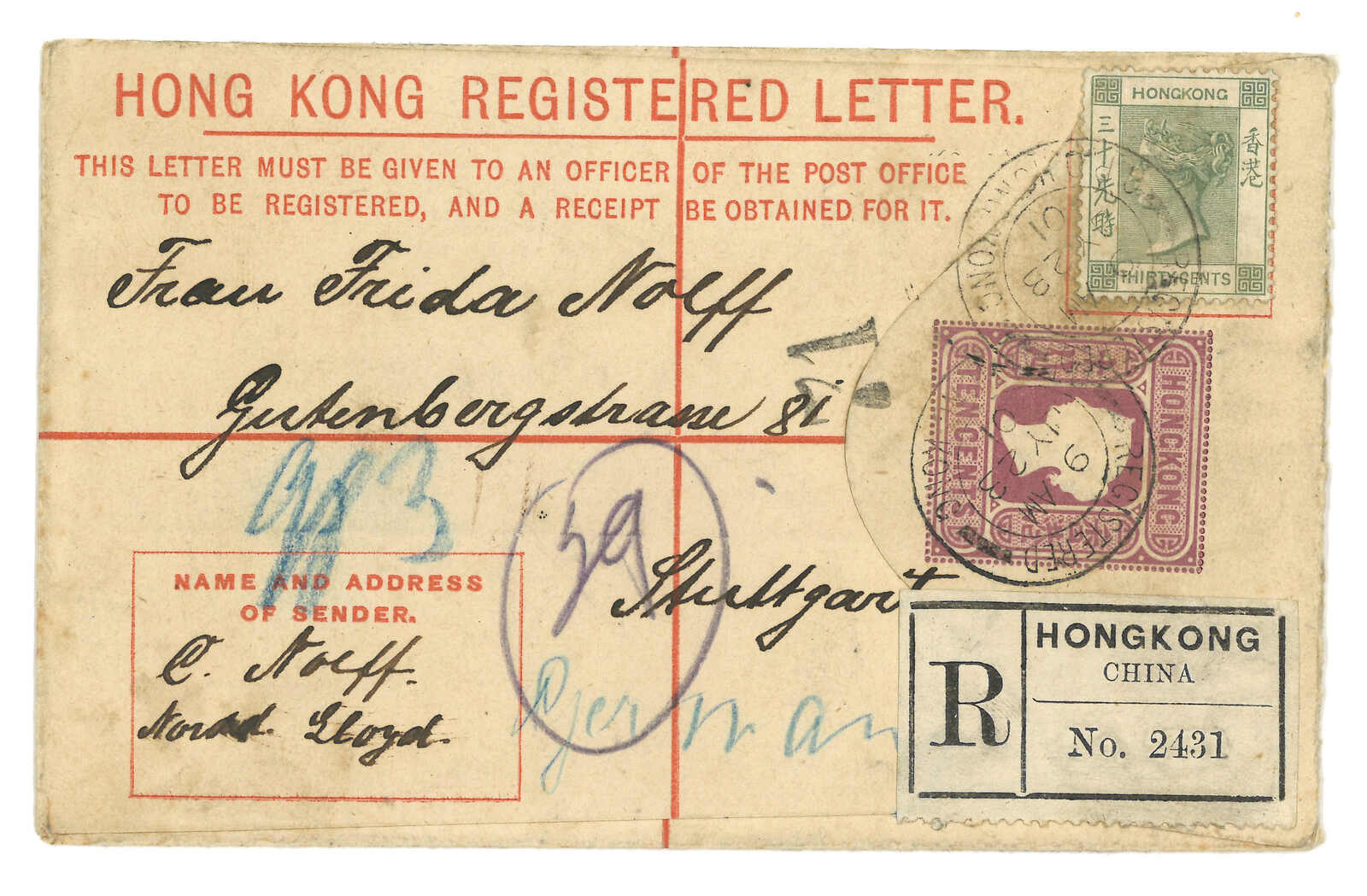 2031 cover image1895 Natal to (1 Mar) to the Chief Engineer onboard, SS Lao Sok, Scottish Oriental Steamship Co, f.w. Natal 2-1/2d. Transit London (23 Mar). Arrived Hong Kong (3 May). Nice incoming cover from South Africa. Example of Scottish Oriental Steamship Co. is also unusual in Hong Kong.