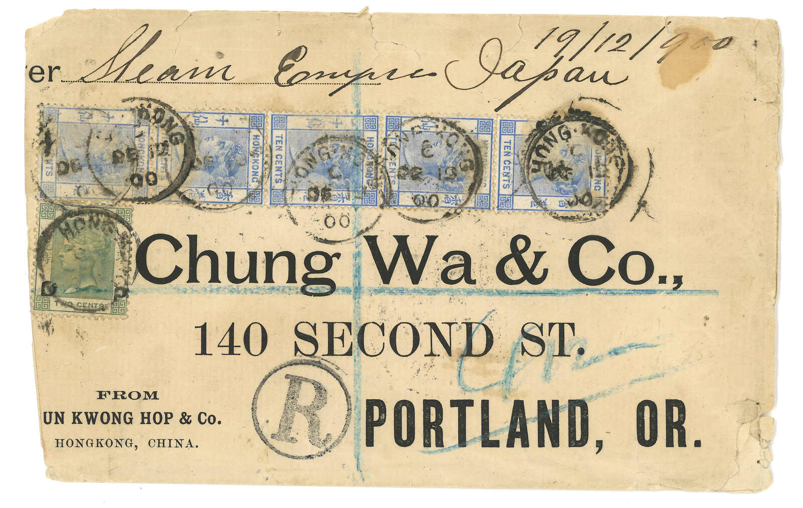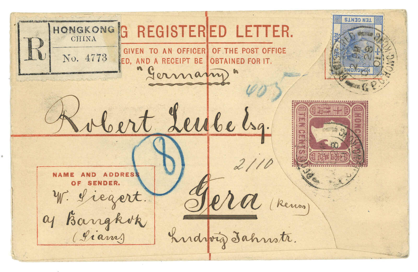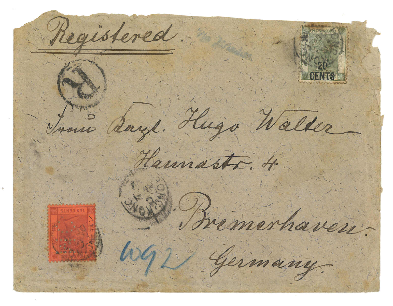 2033 cover image1901 and 1909 a pair of outgoing covers from Hong Kong to USA and Germany, f.w. Hong Kong QV issues with WC perfin or ovpt. DP, tied by Hong Kong cds., alongside with circled R mark.