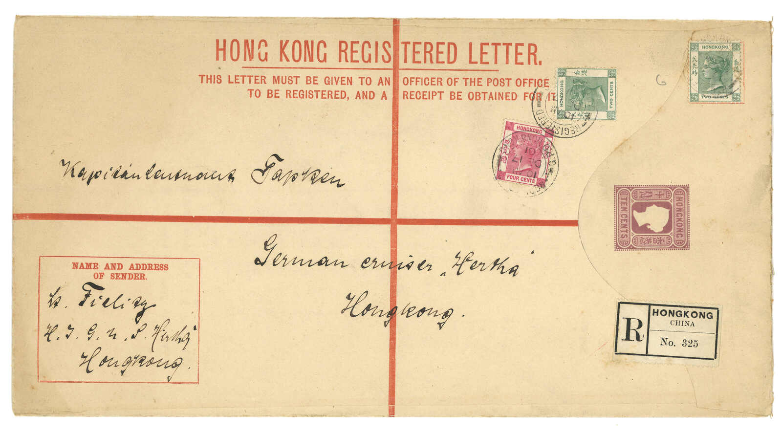 1900前後,香港維多利亞女皇像10仙掛號郵資封(規格F, G, H, H2, K)全套5件,國際實寄,部分帶加貼,旁貼掛號標籤,香港發戳和目的地到戳完整。 上品,一次集全難得。(Image 1) (Image 2) (Image 3) (Image 4) (Image 5) (Image 6) (Image 7) (Image 8) (Image 9) (Image 10)