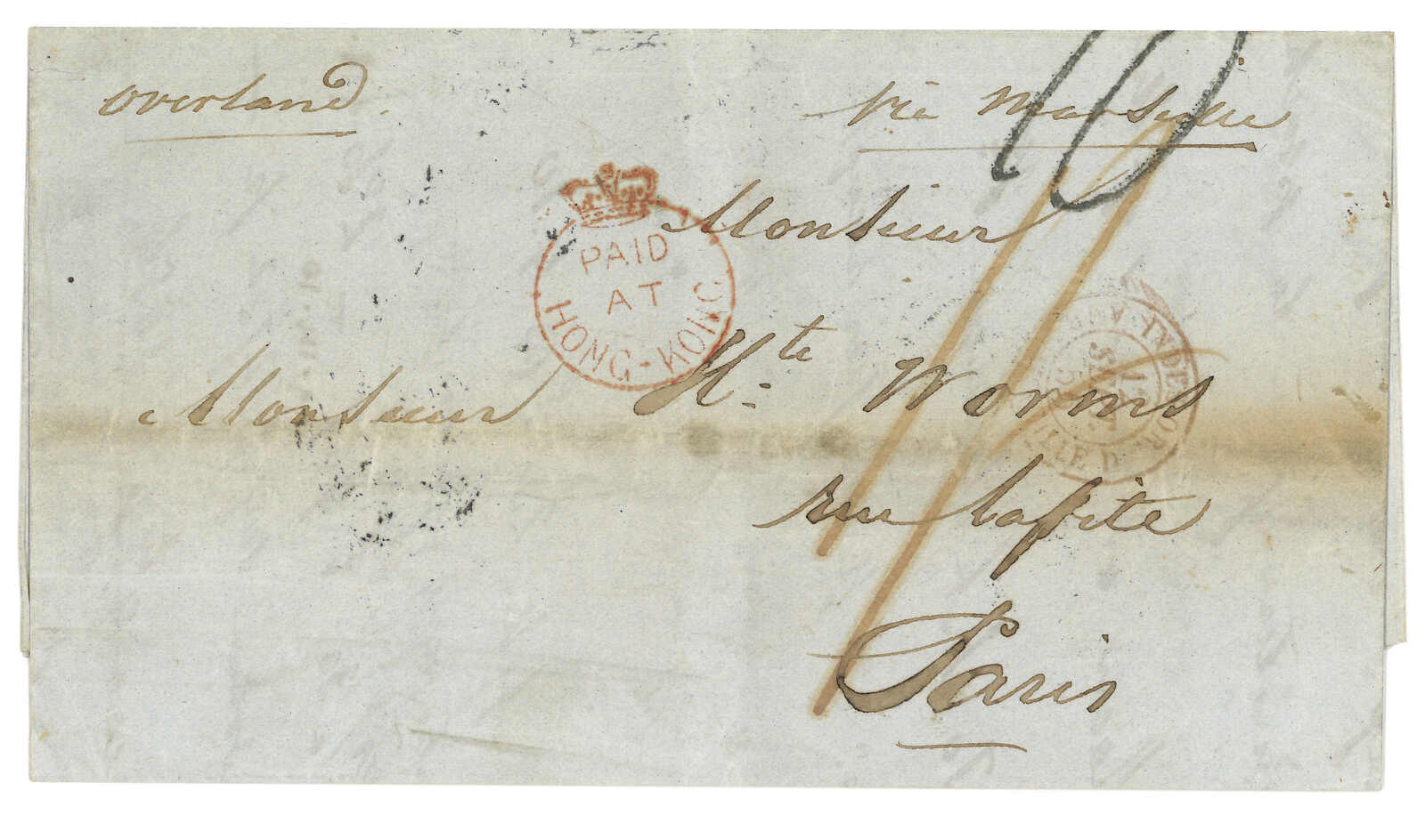 2005 cover image1848 (Nov 29) Hong Kong to France – Joint British/French Packet ServiceA remarkable entire letter endorsed “via Suez et Marseille” and dispatched from Hong Kong on 29 November 1848, bearing a superb strike of the “PAID AT HONG-KONG” crowned circle in red (Webb type 8; Proud PD4, 1847–52 first period), with matching Hong Kong double-arc datestamp on reverse for the same day. Carried by the British packet P&O “Bentinck” to Suez (arr. 4 January 1849), thence by French packet “Osiris” to Marseille (arr. 19 January). On arrival in France, the cover shows the “2 Indes Or. / Marseille” entry marking (19 Jan 1849), together with an extraordinary array of early French railroad cancellations in black ink, including: •“Ligne-de-Tours” (20.1.49) – rare, recorded only Dec 1848–Jan 1849. •“F19” framed – French railroad postal agent marking, not previously recorded on mail from China. •“13/F” circular – another rare railroad agent cancel, likewise not previously seen on China-origin mail. The combination of multiple French railroad cancels (F19 and 13/F) on a cover from China is believed to be the earliest recorded usage, and unique in exhibiting such postal-agent markings on Hong Kong–origin mail.This cover represents an exceptionally early and rare intersection of British colonial postal markings with French inland rail distribution. Joint British/French packet service mail from China is seldom encountered.(Image 1) (Image 2)