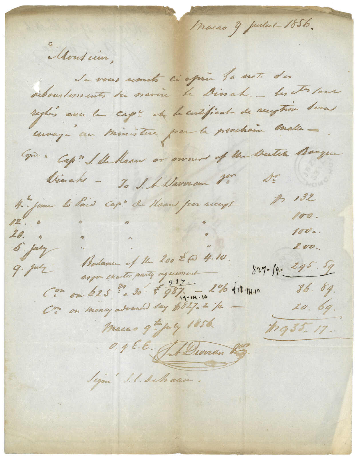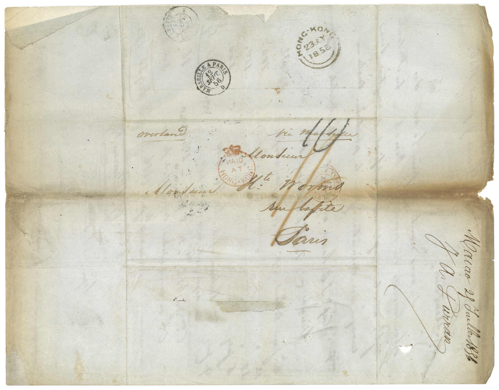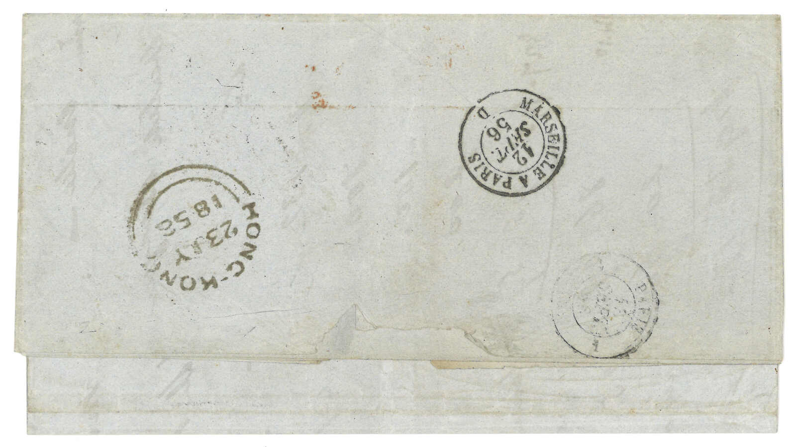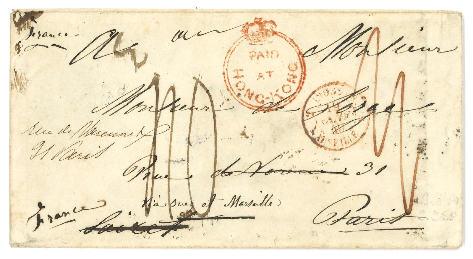1856.7.9 澳門經香港寄法國。郵簡,寫有“via Marseilles”及郵資“1/-”、“10”,鈐Webb 11型香港已付皇冠圓戳及9.12香港雙孤日戳。 9.12經馬賽。9.18抵巴黎。2012.12 Interasia,拍品號3592。(Image 1) (Image 2) (Image 3) (Image 4)