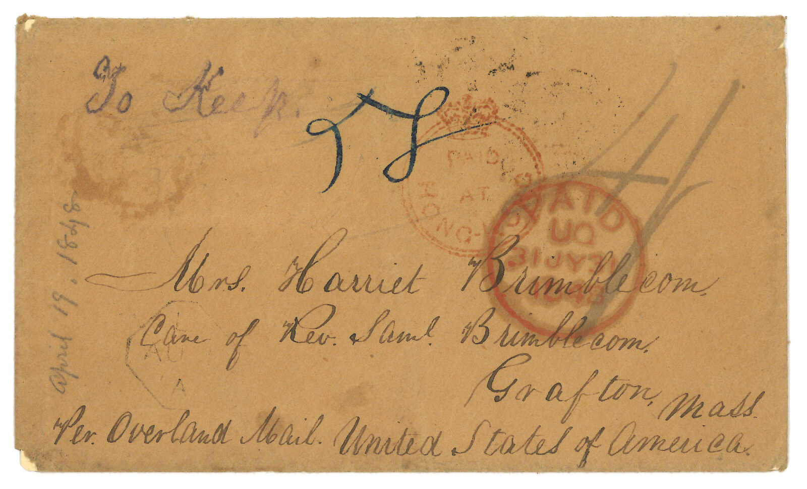 2010 cover image1859 Augustine Heard & Co., Hong Kong (28 Oct) to USA, sent “via Marseilles” and rated “80” and changed to “90”, applied with Hong Kong cds. Transit London (15 Dec). Arrived Boston (2 Jan). This mail was carried by Norna, Candia and Panther.