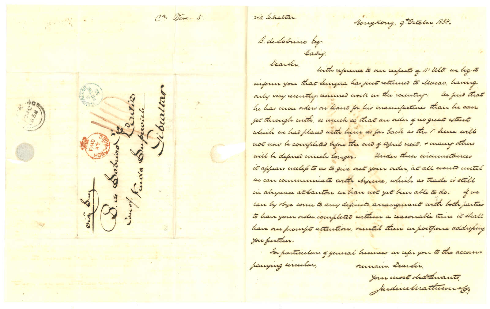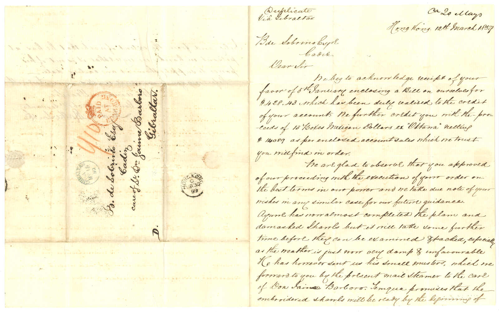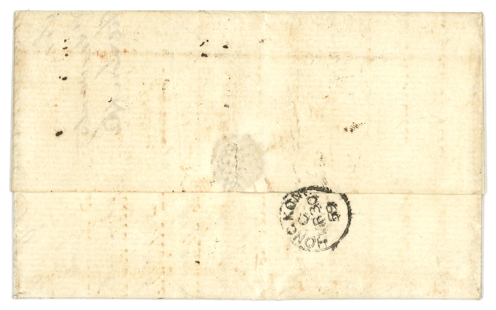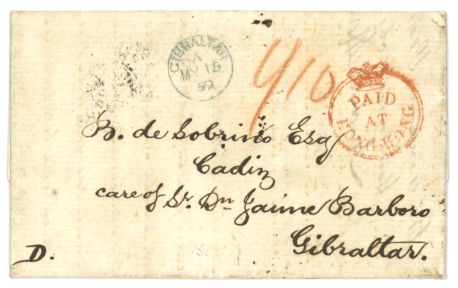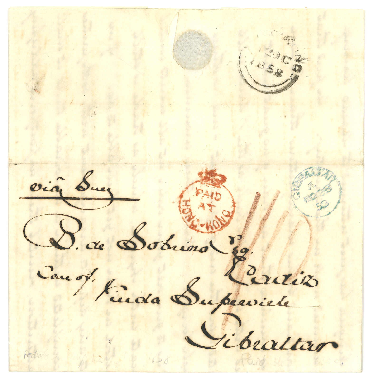 2009 cover image1859 (May 15) a very neat entire addressed to B. de Sobrino Esq. CADIZ, care of Sr. Du Jaime Barboro, GIBRALTAR. On the obverse, cancelled by a very fine strike of large crown “PAID AT HONG-KONG” (Webb type 7) cancellation in red, transit c.d.s. in green blue “GIBRALTAR / A / MY 15 / 59”, manuscript rate “1/10” in red crayon. On the reverse, cancelled by black c.d.s. “HONG KONG / C / MR 30 / 59”. Very good conditions.(Image 1) (Image 2) (Image 3) (Image 4)