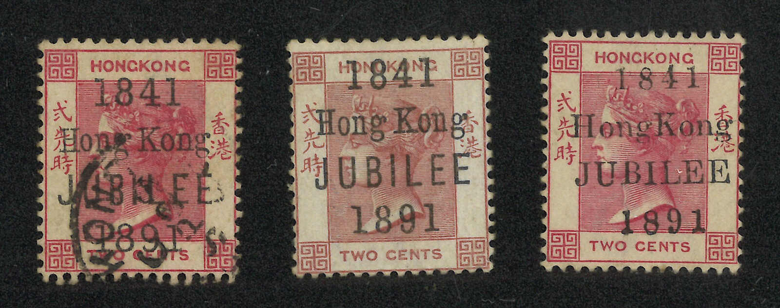 1891年開埠五十週年假票一組三枚,加蓋字體不一,十分有趣。(Image 1) (Image 2)