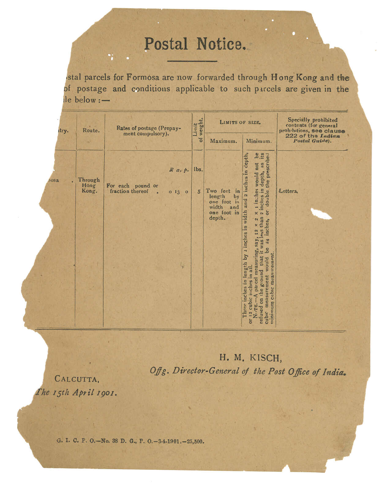 1901.4.15及1945.11.7 兩件印度郵政之通知,前者有關經香港寄台灣之郵路變化,左右方被裁。後者宣佈恢復對先前被日本佔領的地區送件。(Image 1) (Image 2)