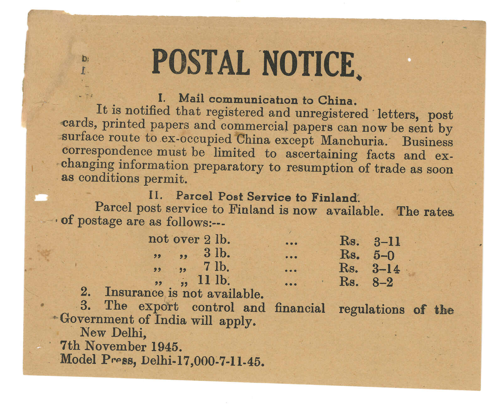 2034 cover image1901 (15 Apr) and 1945 (7 Nov) a pair of postal notice issued by Indian post. Former was about the change of route to Taiwan via Hong Kong, trimmed at left and right. Latter announcing the resumption of services to ex-occupied area in China.