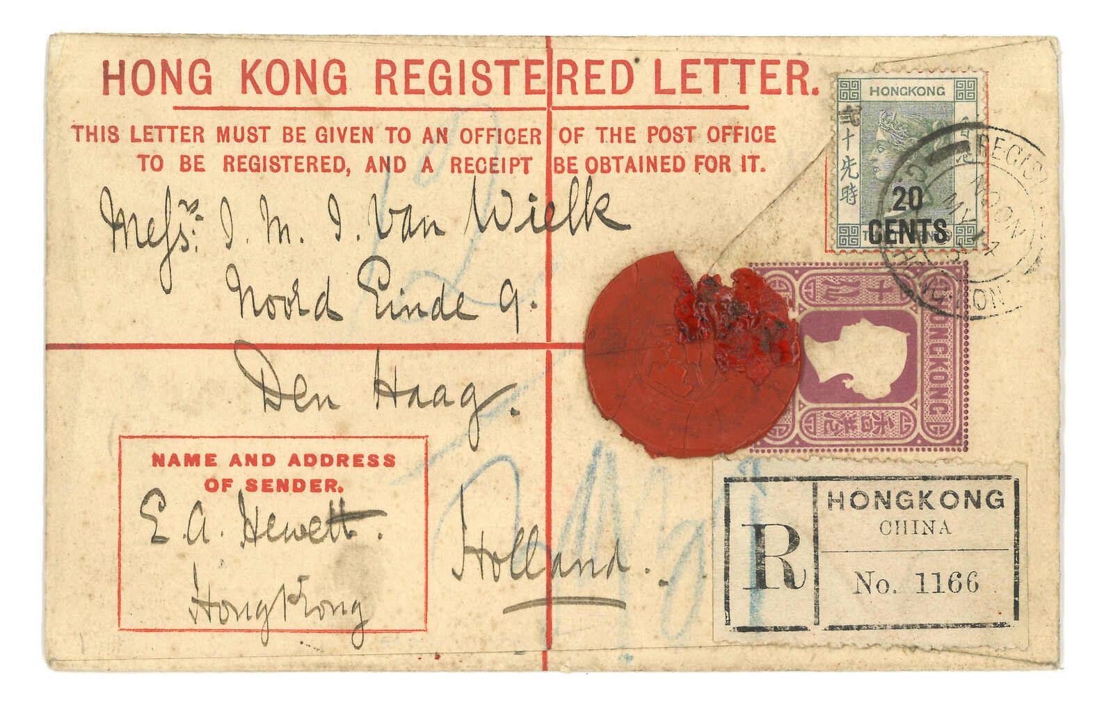 1901.5.14 香港維多利亞女皇像10仙掛號郵資封(size F 3-1/4 x 5-1/4 inch)寄荷蘭,加貼改值20仙蓋10仙連中文面值,銷總局掛號日戳,旁見掛號標籤。6.17抵Gravenhage。(Image 1)