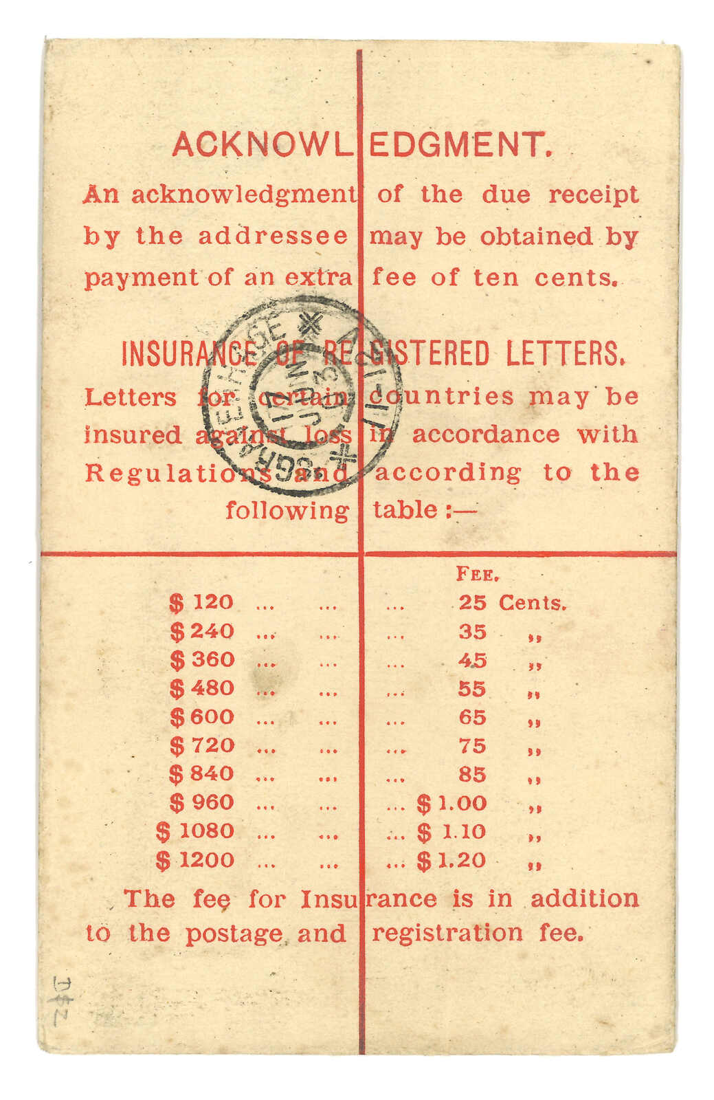 1905 (23 May) Hong Kong QV 10c stationery cover (size H, 5 x 8 inch) with surch insurance fee 25c to $2.5, sending to Ceylon, no further adhesive, tied by registered GPO cds., alongside with type RL8 registered mark. Arrived