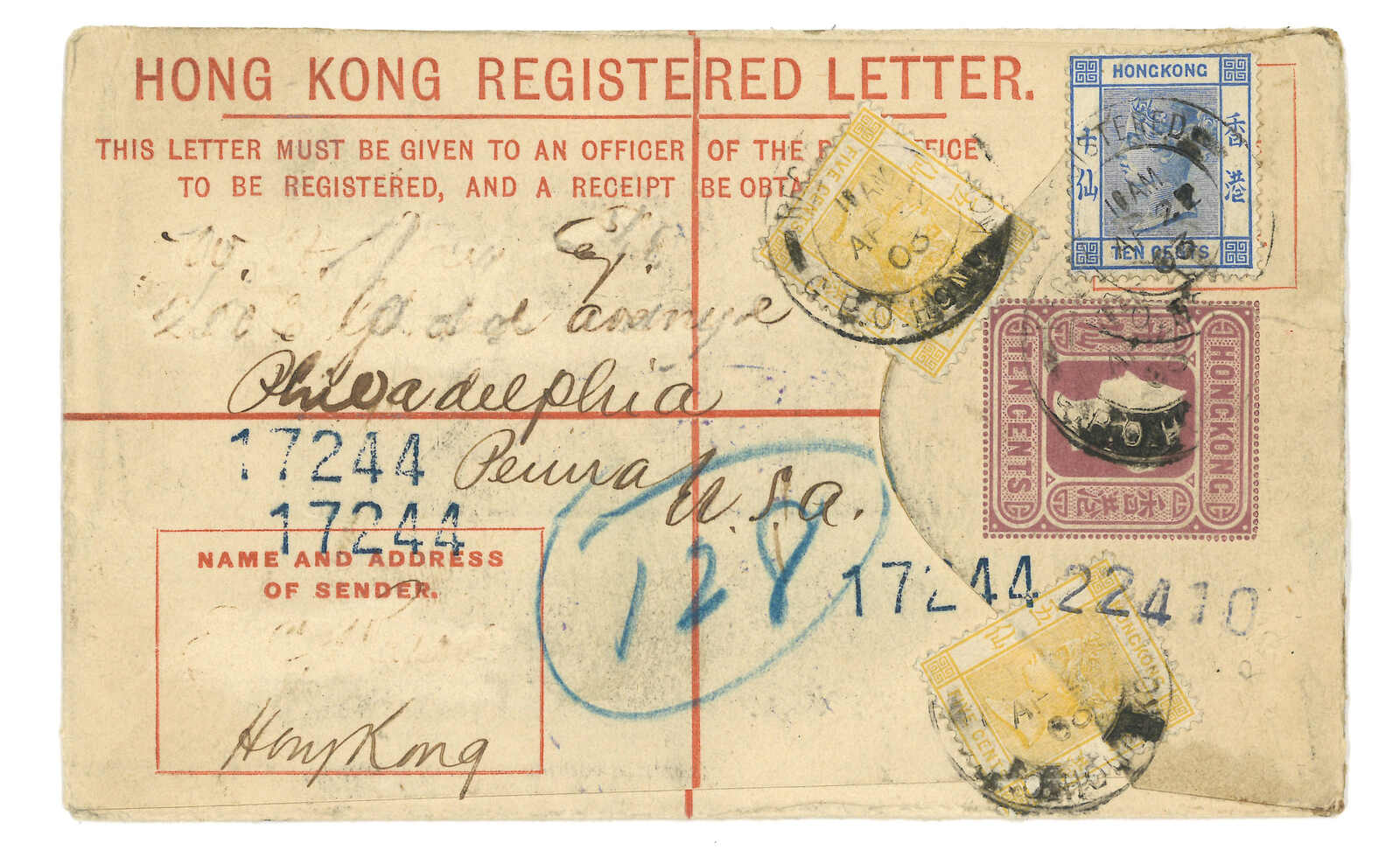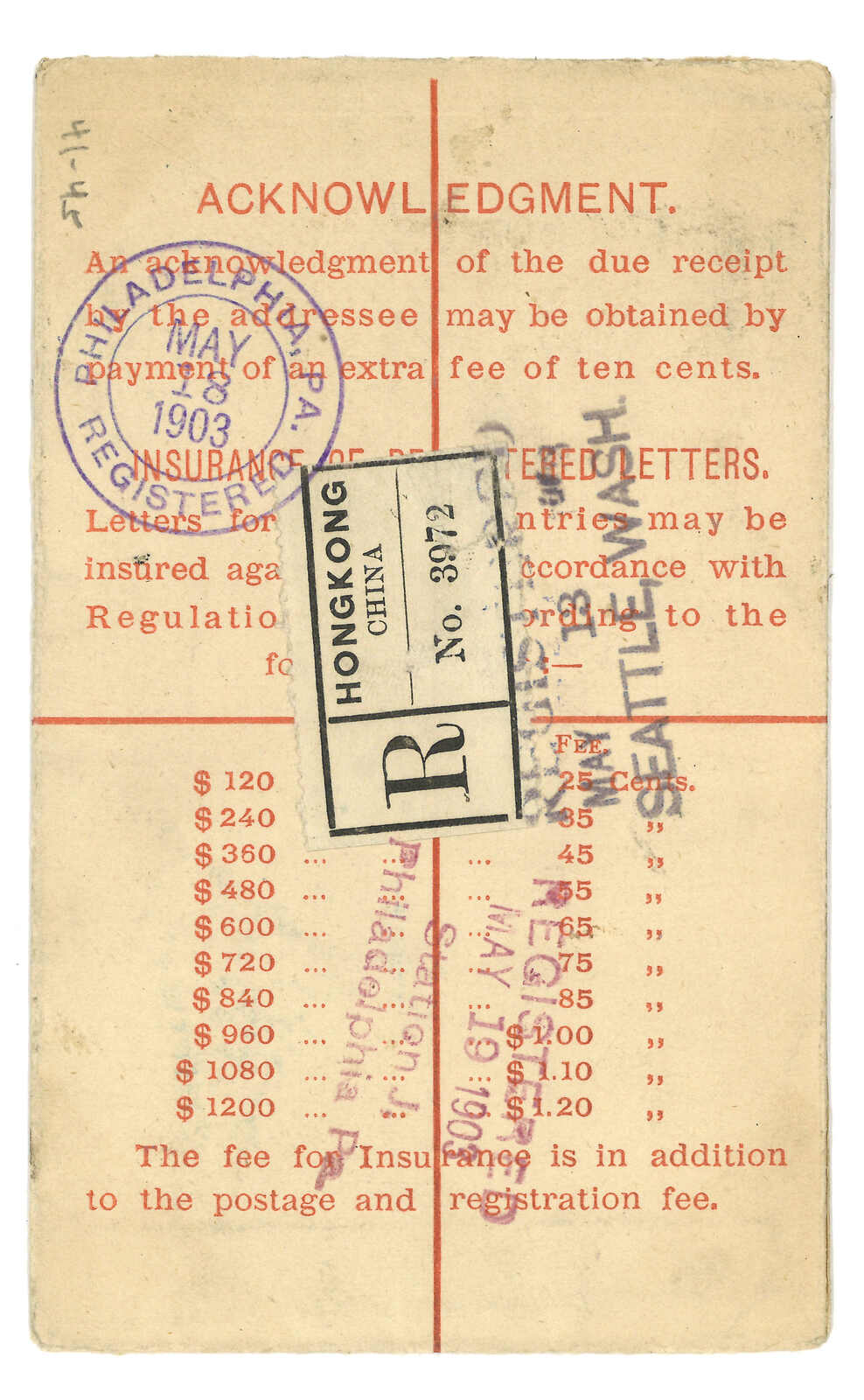 1903.4.22 香港維多利亞女皇像10仙掛號郵資封(size F 3-1/4 x 5-1/4 inch)寄美國,加貼5仙 + 10仙,銷總局掛號日戳。背貼掛號標籤。5.13經西雅圖。5.18抵費城。(Image 1)