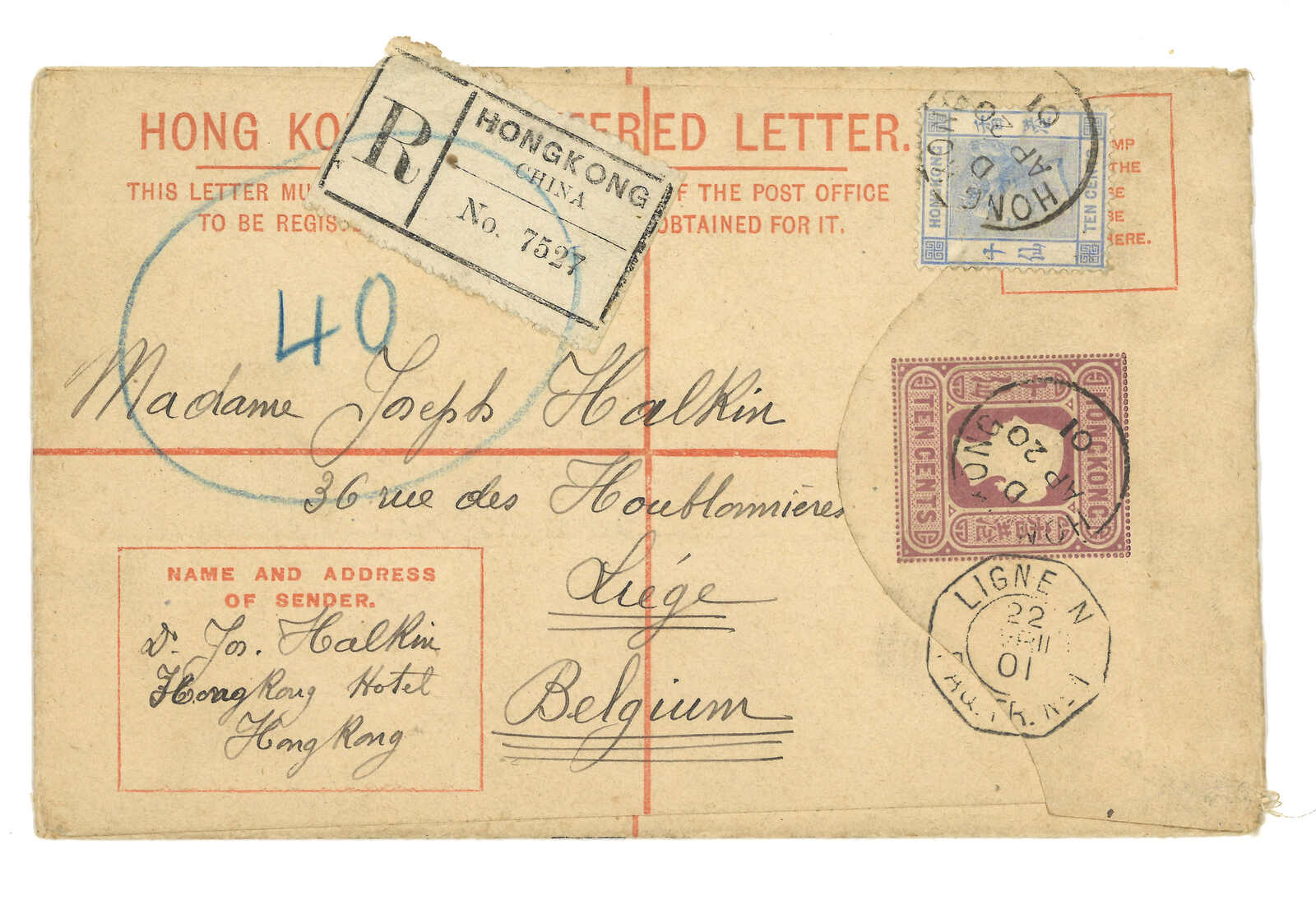 1901 (20 Apr) Hong Kong QV 10c registered stationery cover (size G 3-3/4 x 6 inch) to Belgium, uprated by 10c, tied by Hong Kong index D cds, alongside with registered label. Transit French paquebot (22 Apr). Arrived Liege (20