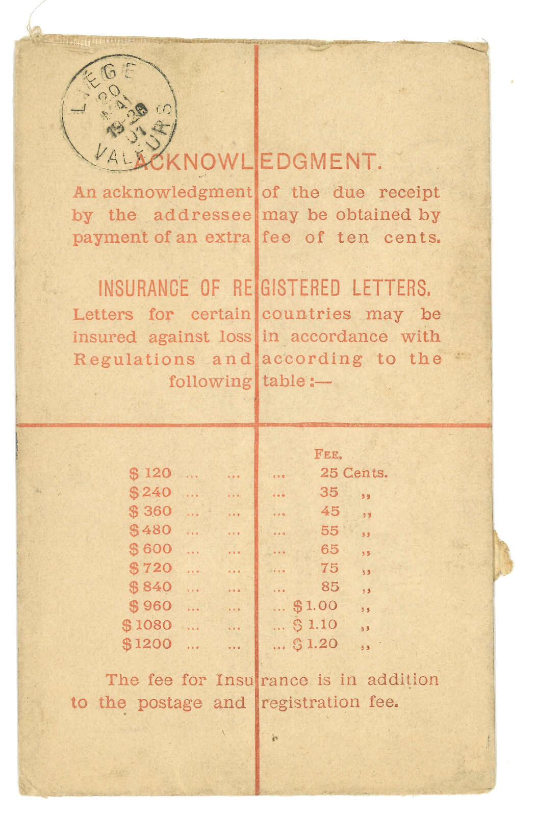 1901.4.20 香港維多利亞女皇像10仙掛號郵資封(size G 3-3/4 x 6 inch)寄比利時,加貼10仙,銷香港D字日戳,旁貼掛號標籤。4.22經法國郵船。5.20抵Liege。(Image 1)