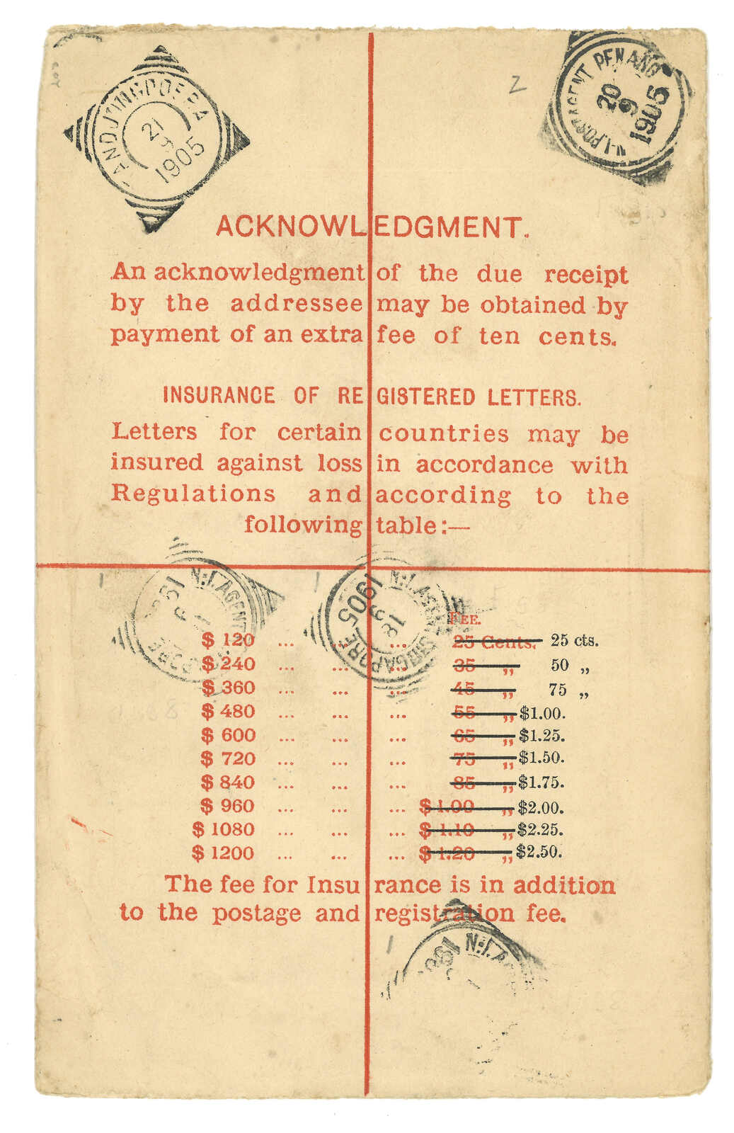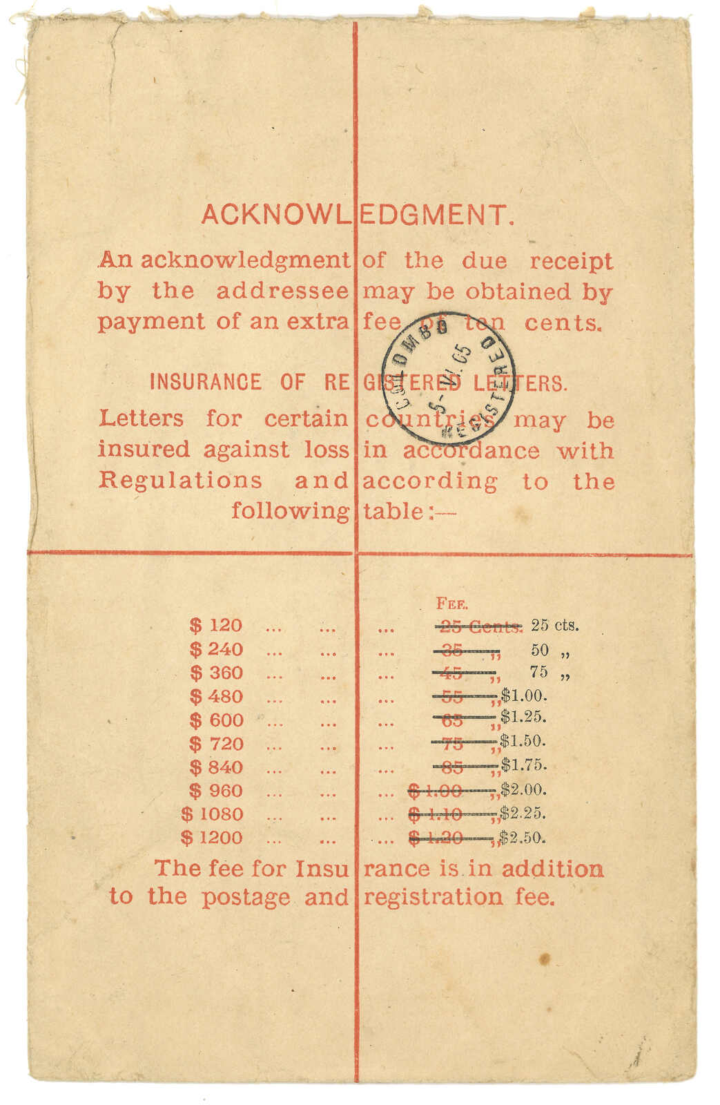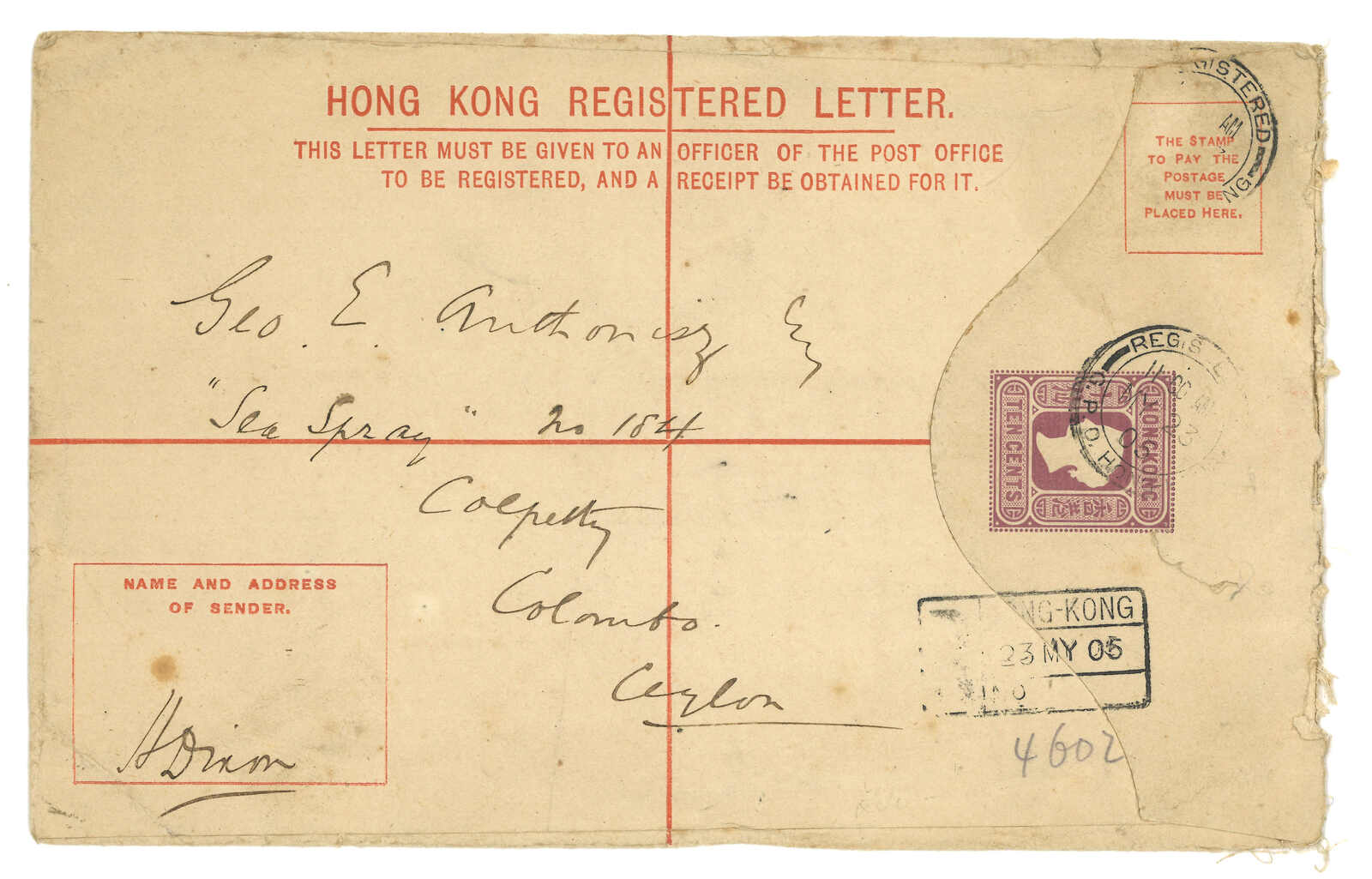 1905.5.23 香港維多利亞女皇像10仙掛號郵資封(size H 5 x 8 inch),保費加蓋改作25仙至2元5角,寄錫蘭,無加貼票,銷總局掛號日戳, 旁鈐RL8型掛號章。6.5抵可倫坡。(Image 1)