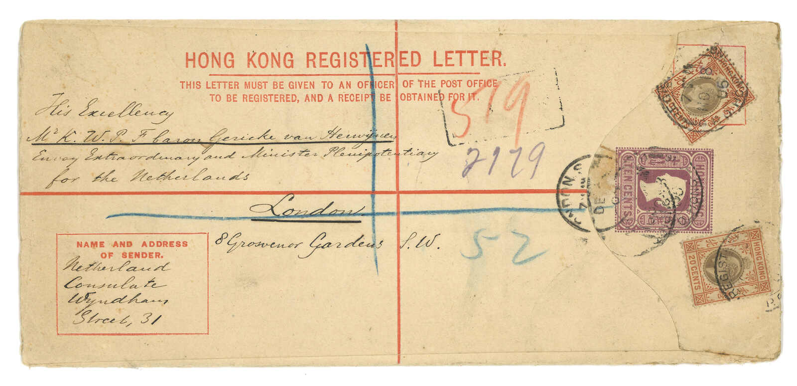 1905.11.18 香港維多利亞女皇像10仙掛號郵資封(size H2 4 x 9 inch),保費加蓋改值25仙至2元5角,自荷蘭領事館寄倫敦, 加貼愛德華七世2x 20仙,銷總局掛號日戳,旁鈐掛號章。H2改值掛號封實寄難得。(Image 1)