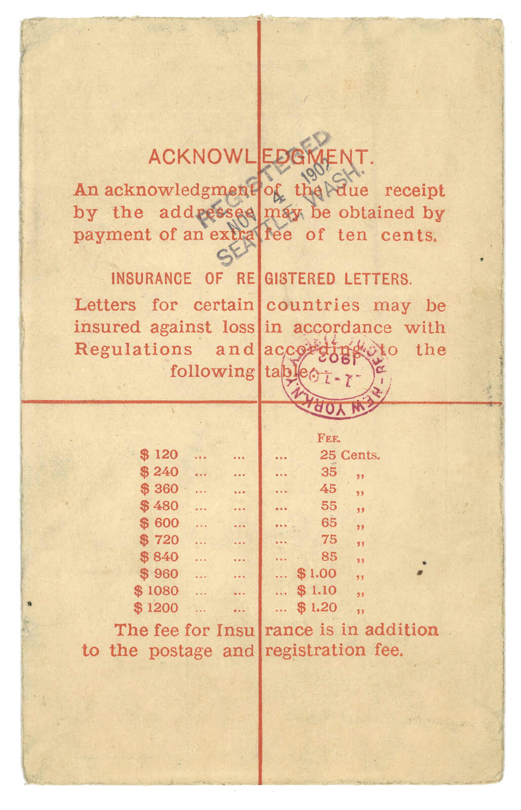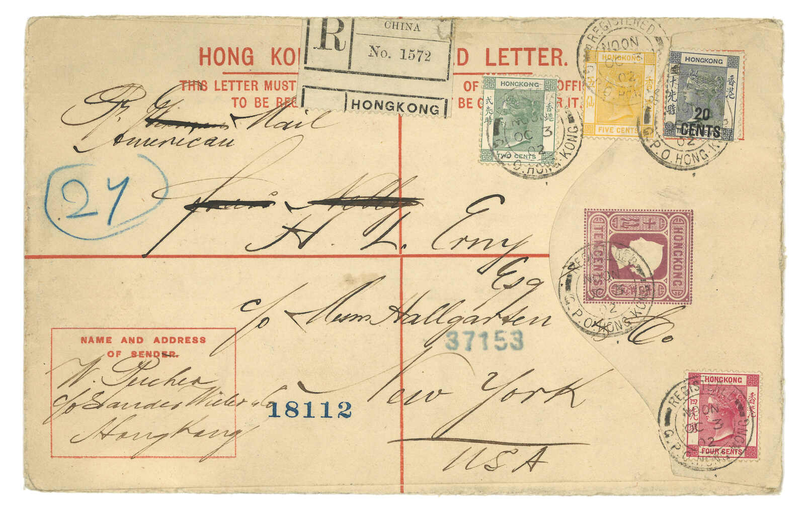 1902.10.3 香港維多利亞女皇像10仙掛號郵資封(size H 3 x 4 inch)寄美國,加貼維多利亞女皇像2仙 + 4仙 + 5仙 + 改值20仙(溢貼1仙),銷總局掛號日戳,旁見掛號標籤及“Pr American Mail”批注。11.4經西雅圖。抵紐約。(Image 1)
