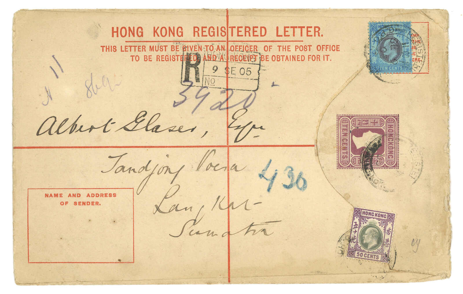 1905.9.5 香港維多利亞女皇像10仙掛號郵資封(size H 5 x 8 inch),保費加蓋改作25仙至2元5角,寄印尼,加貼愛德華七世10仙 +