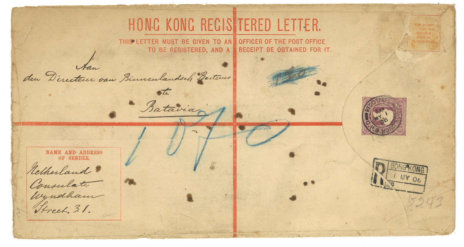 1906.5.1香港維多利亞女皇像10仙掛號郵資封(size H2 4 x 9 inch),保費加蓋改值25仙至2元5角,自荷蘭駐港領事館寄印尼,銷總局掛號日戳,旁鈐RL8型掛號章。(Image 1)
