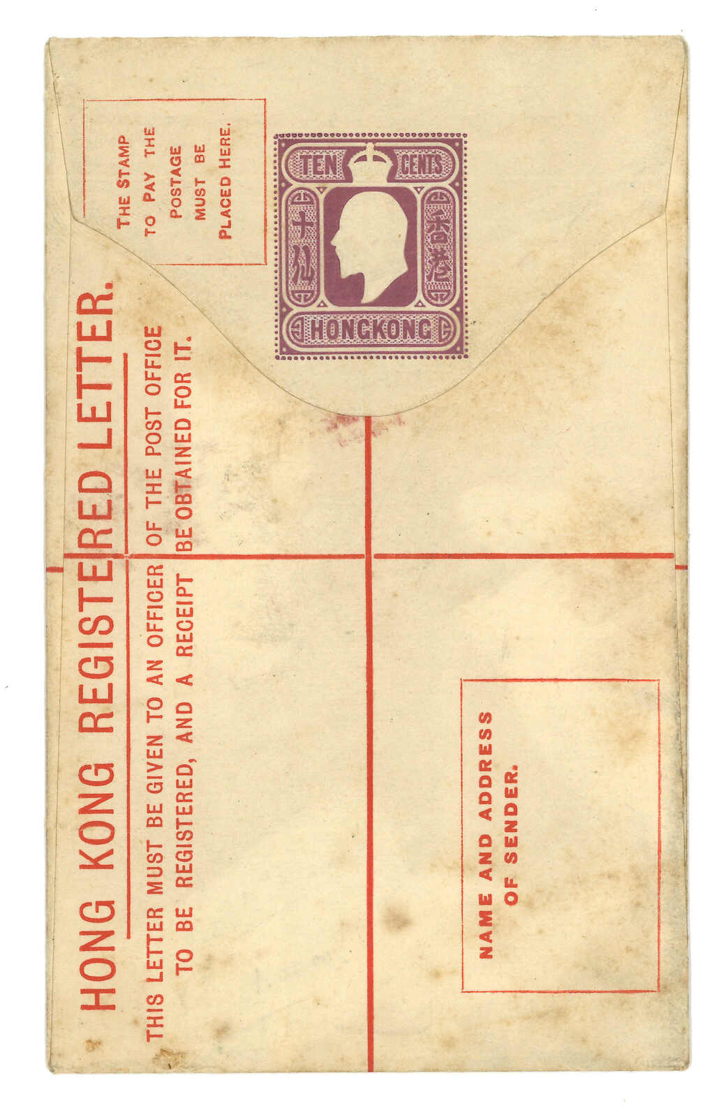 1901 (14 May) Hong Kong QV 10c registered stationery cover (size F 3-1/4 x 5-1/4 inch) to Holland, uprated by surch 20c/10c with Chinese character, tied by GPO registered cds, alongside with registered label. Arrived Gravenhage