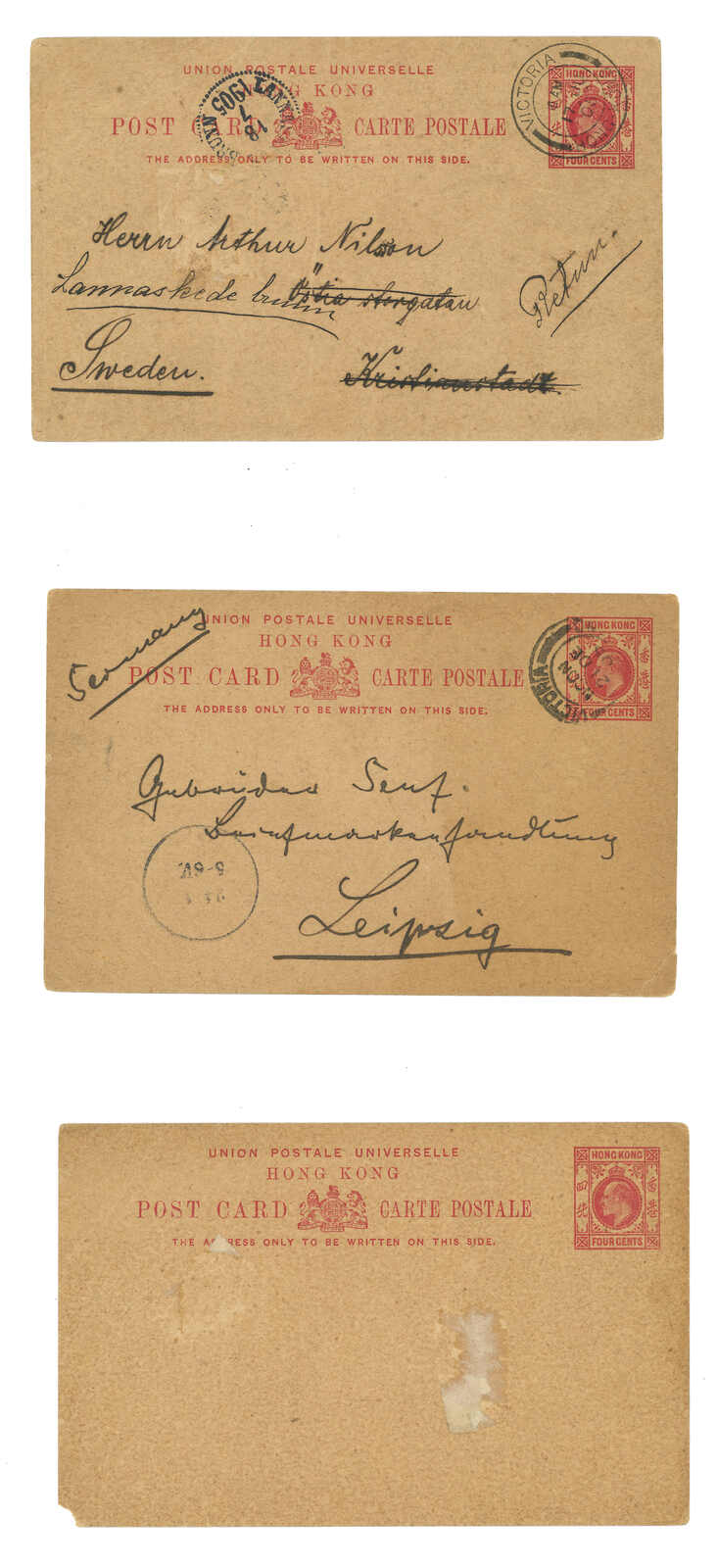 1903至1909年香港愛德華七世4仙洋紅郵資片(楊目P22),當中一張為新,兩張實寄。(Image 1)