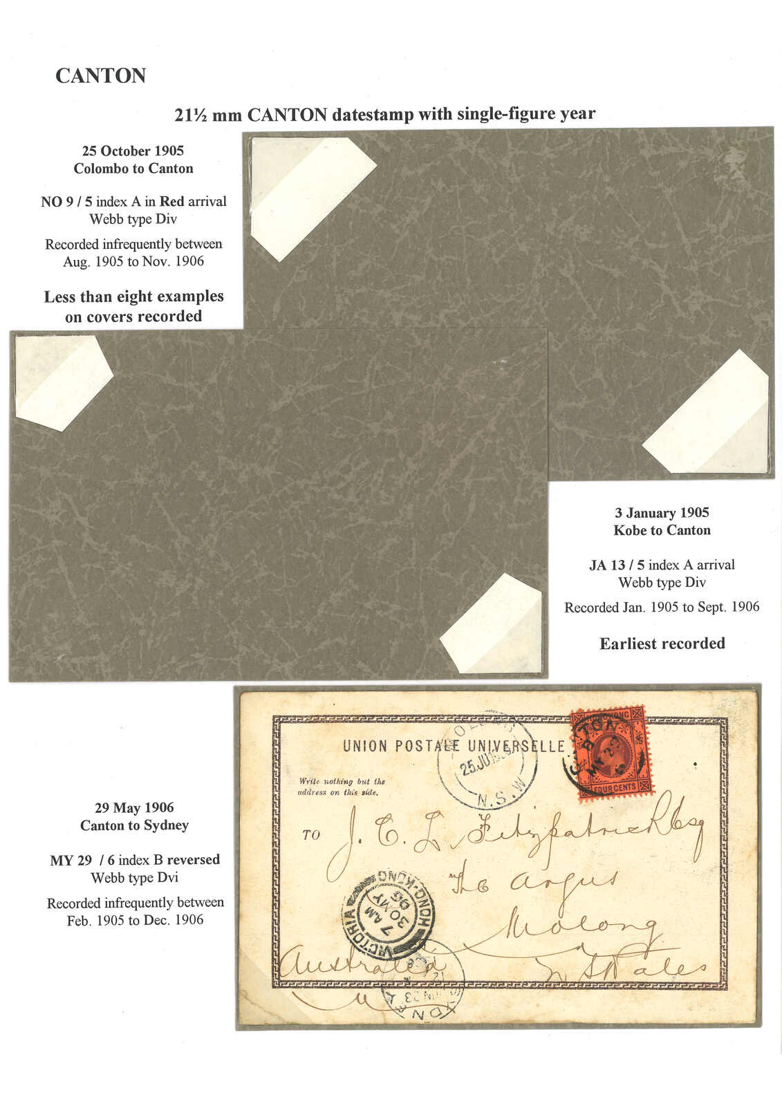 1906 Canton (29 May) to Australia. Picture postcard, f.w. Hong Kong KEVII 4c, tied by scarce Canton BPO Webb type Dvi (index reverse B) cds. Transit Hong Kong (30 May), Sydney. Arrived Molong (25 Jun). This type of cds features