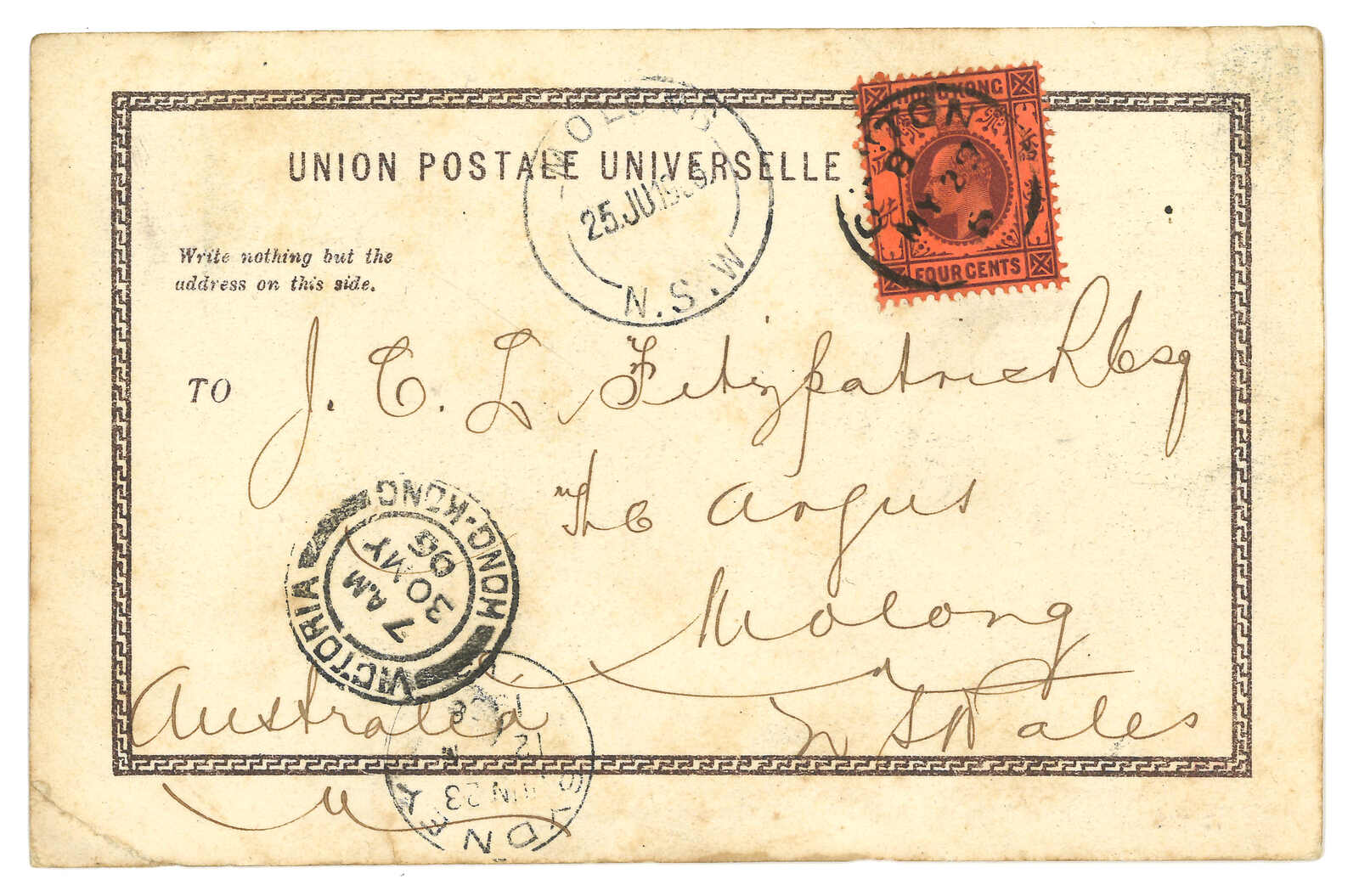 1906.5.29 廣州寄澳洲。圖片明信片,貼香港愛德華七世4仙,銷少見之廣州英局Webb Dvi型(反B字)日戳。5.30經香港,隨後經悉尼。6.25抵Molong。此款日戳特徵為帶有反B字,年份僅有單位數。(Image 1)