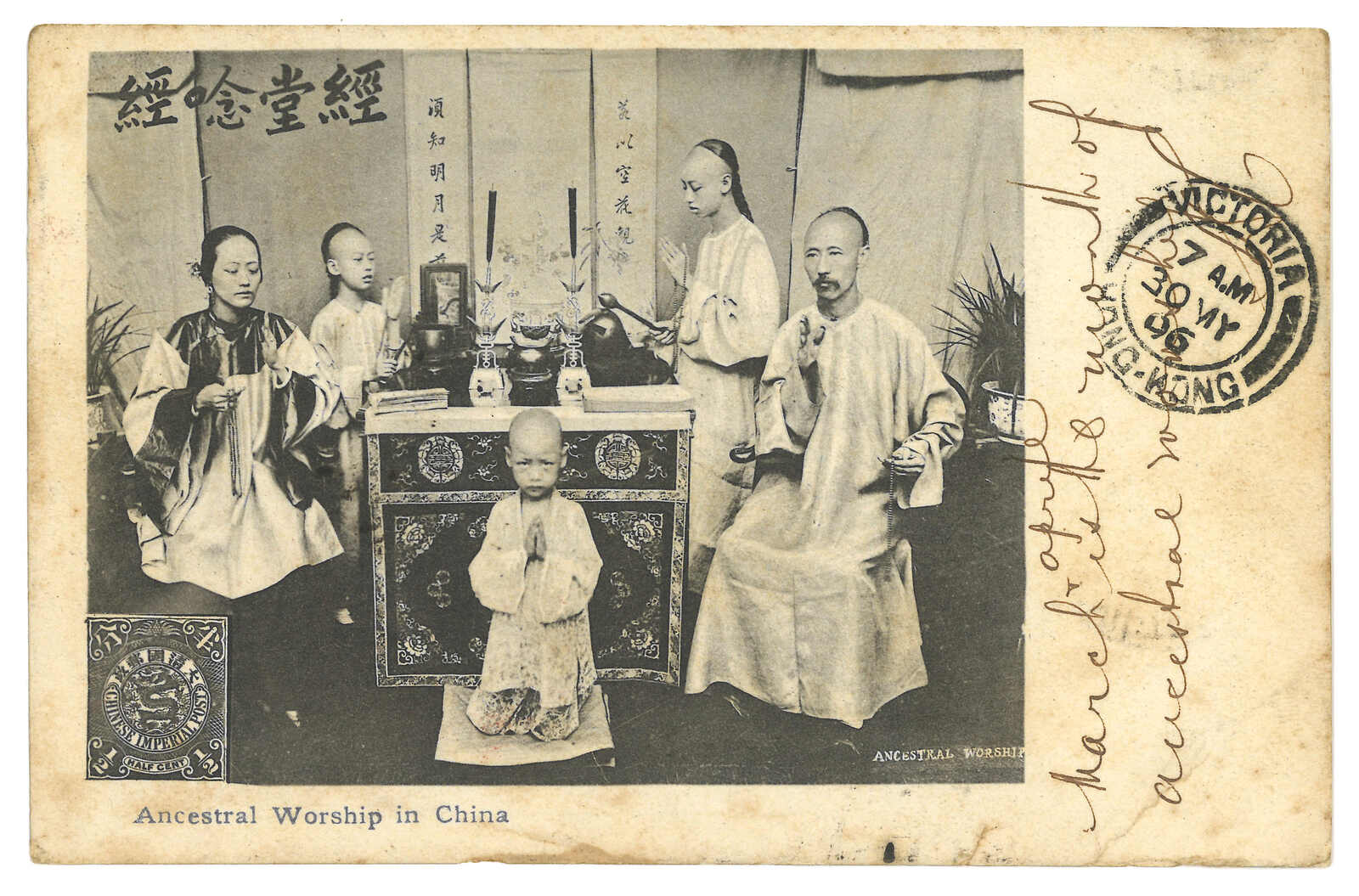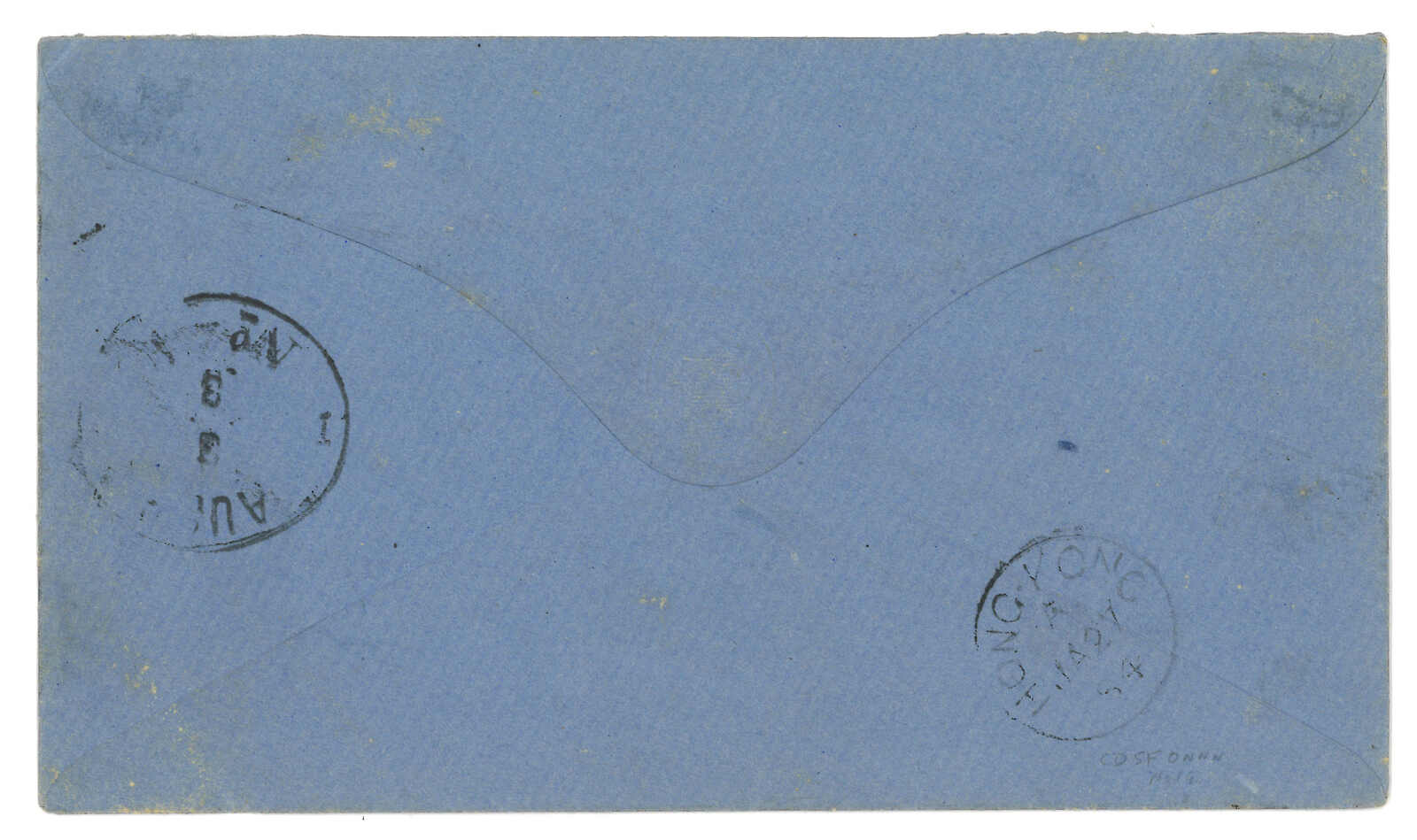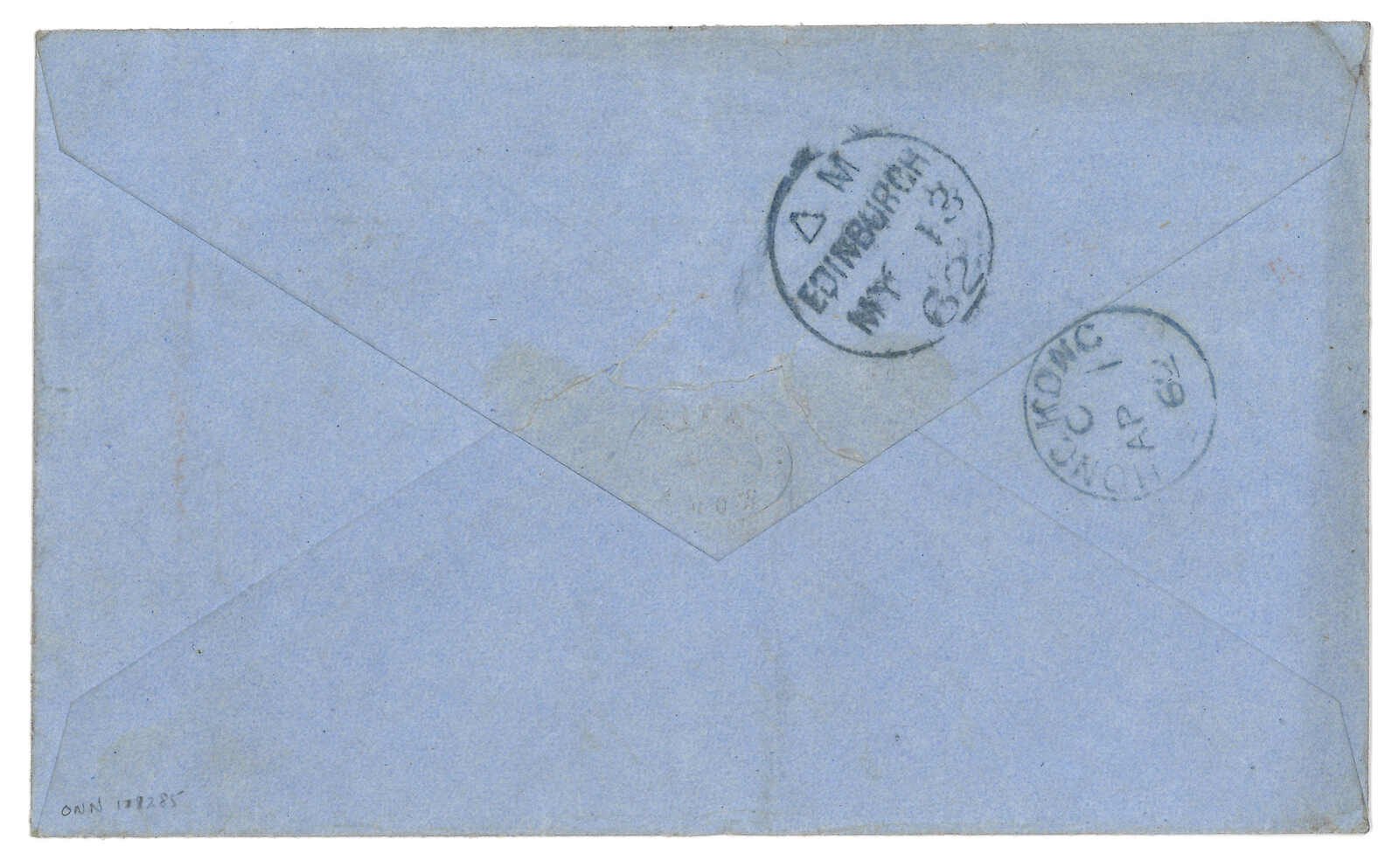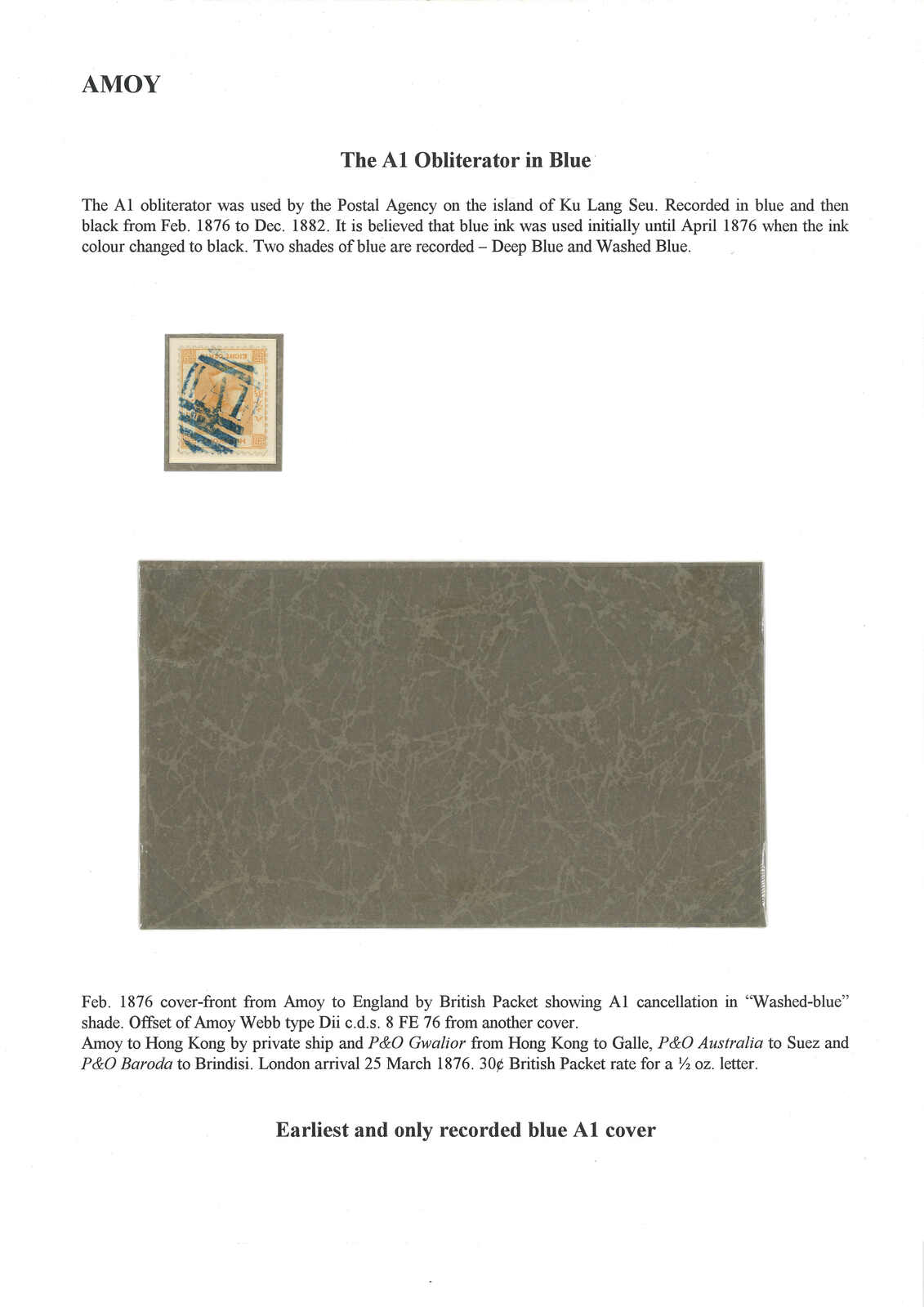 廈門寄英國封面,貼香港維多利亞女皇像30仙,銷藍色A1殺手戳。Webb記錄中蓋有A1殺手戳之封片有十八件。此為唯一一件蓋有藍色A1戳者。(Image 1)