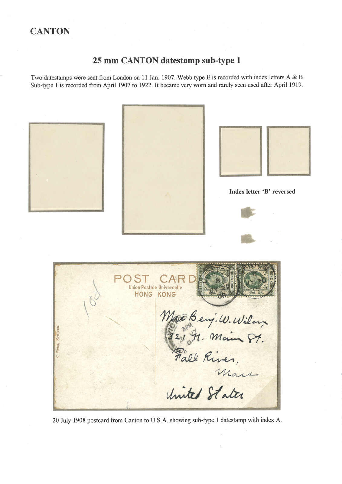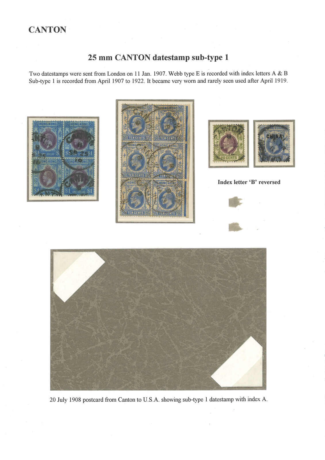 1908 Canton (20 Jul) to USA. Picture postcard, f.w. Hong Kong KEVII 2c in pair, tied by Canton BPO Webb type Ei (index A) cds. Webb stated that indedx A is rarer than index B.