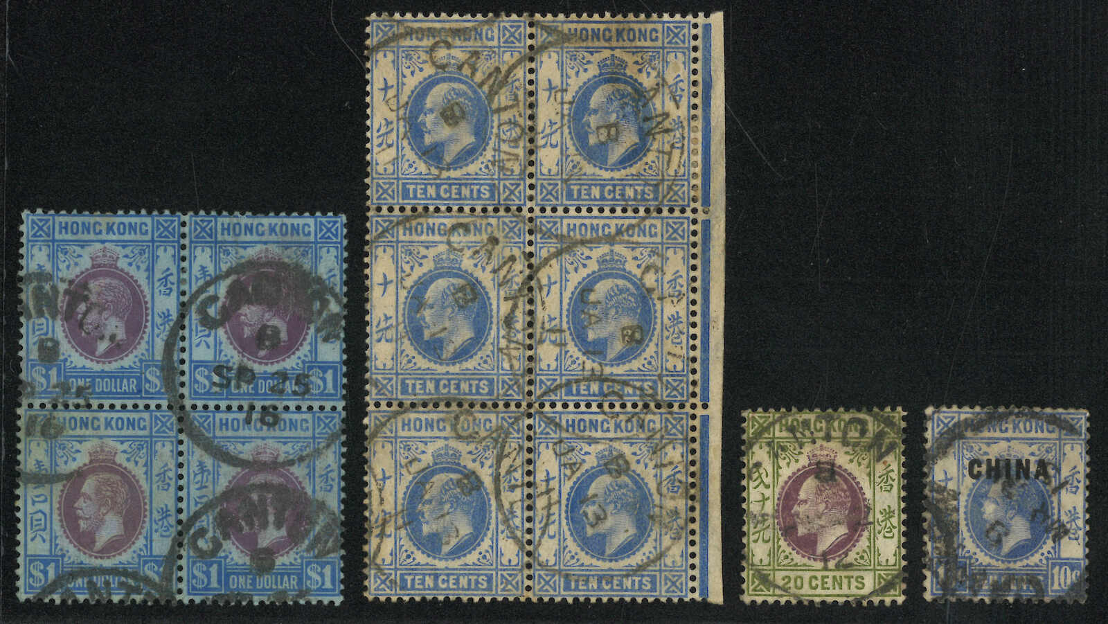 A group of Hong Kong KEVII, KGV and KGV ovpt. CHINA used stamps used by Canton BPO Webb type Eii (index B) and Eiii (reversed B) cds. Examples of type Eiii cds are rather rare.