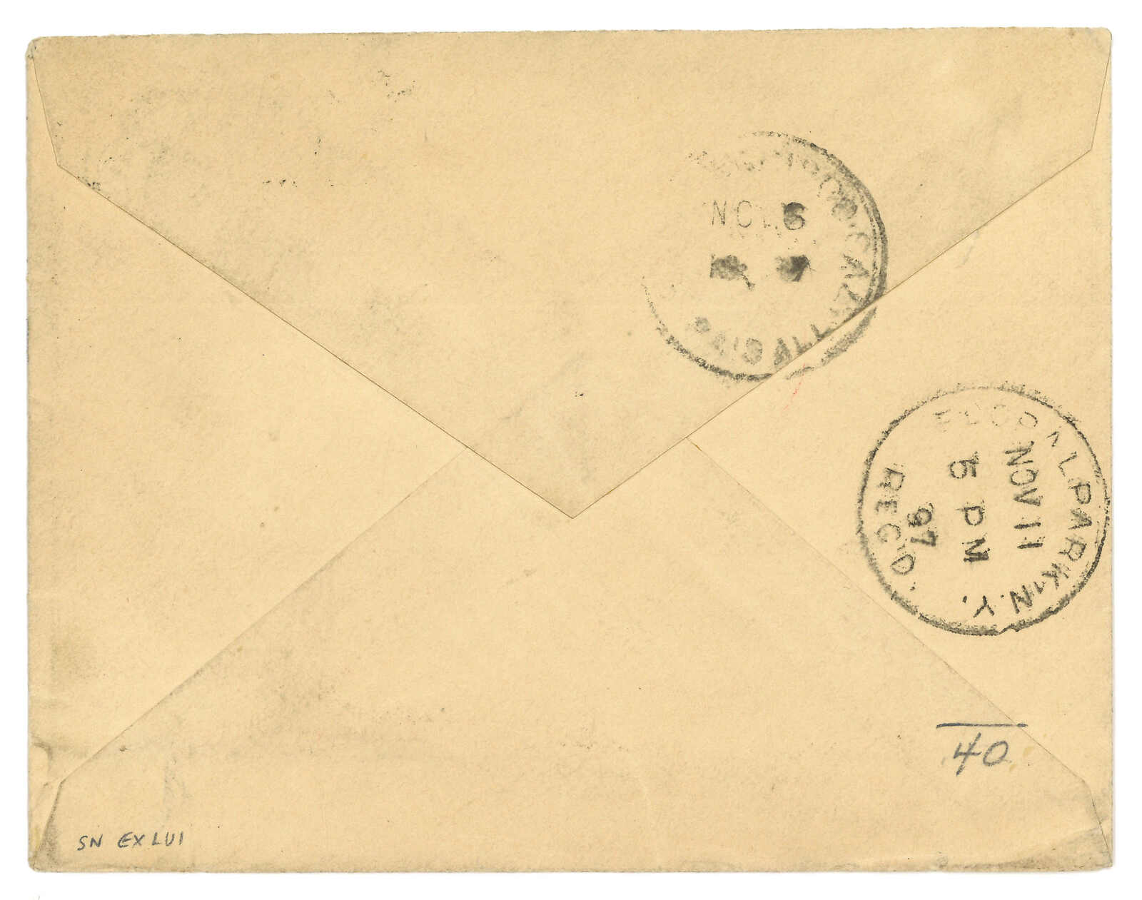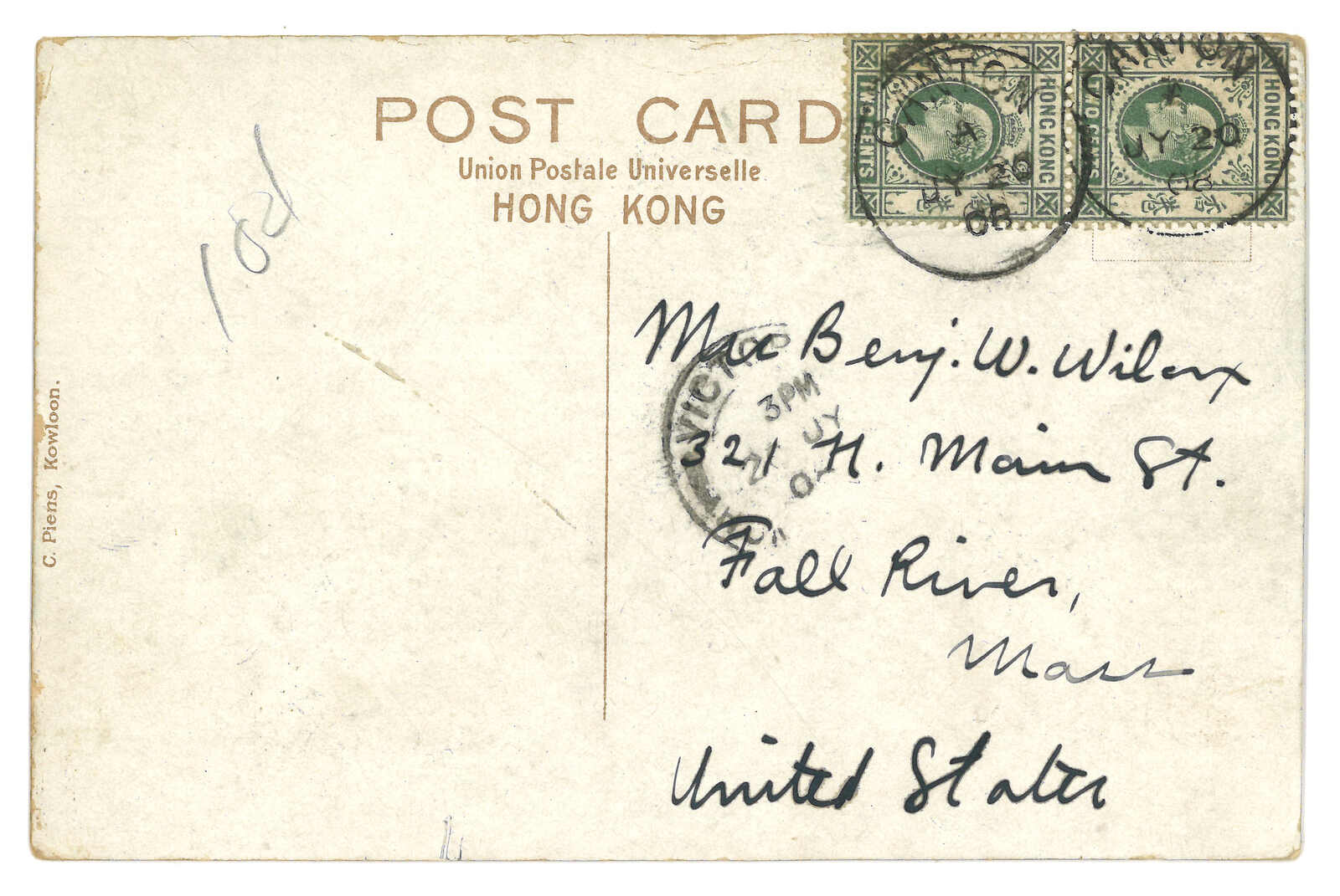 廈門寄美國,貼香港維多利亞女皇像4仙雙連 + 2仙,合10仙萬國郵盟郵資,銷廈門英局Webb Dii型日戳。寫有“Pr Coptic”批示。11.6經三藩市。11.11抵紐約。(Image 1)