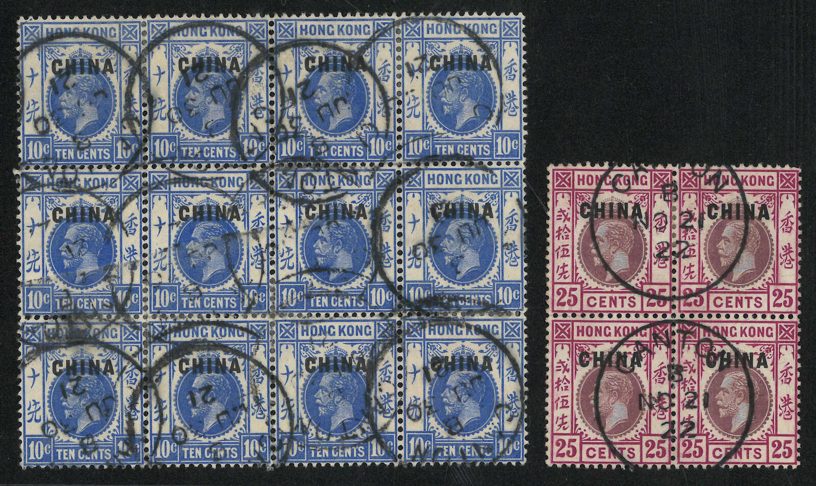 Hong Kong KGV ovpt. CHINA 10c and 25c used blocks, both tied by Canton BPO Webb type Eii cds.