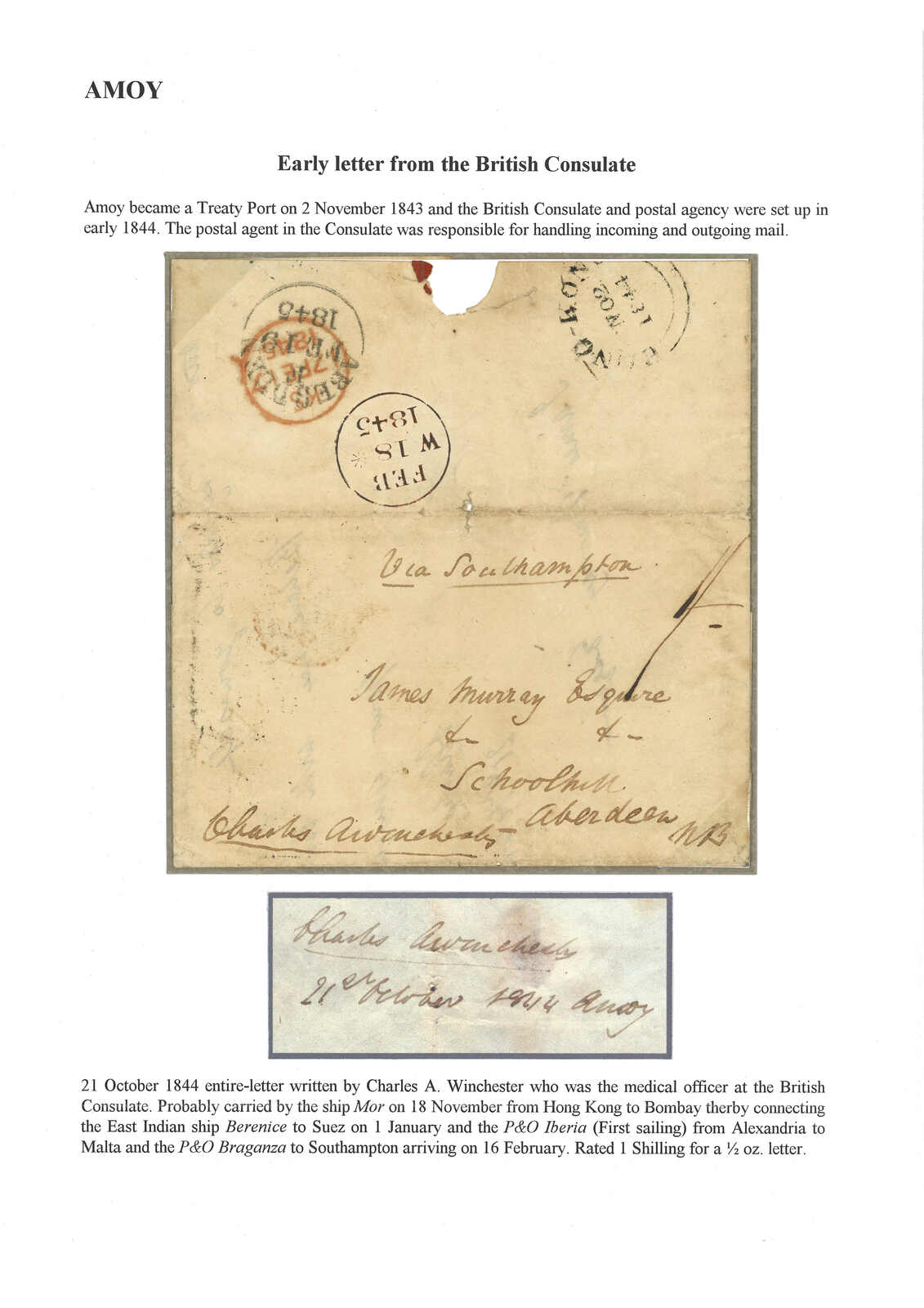 1844.10.21 由英國領事館醫生Charles A Winchester寄蘇格蘭。郵簡,寫有“via Southampton”及“1/-”郵資,應是由Mor號送至香港,鈐香港11.2中轉戳。2.17經倫敦。2.19抵鴨巴甸。 Webb A型“AMOY PAID”日戳抵達前之廈門史前封十分稀罕少見。Webb記錄中僅見一件,日期為1846年3月15日,同樣由領事館寄蘇格蘭,郵資相同並同樣蓋有香港中轉戳。(Image 1)
