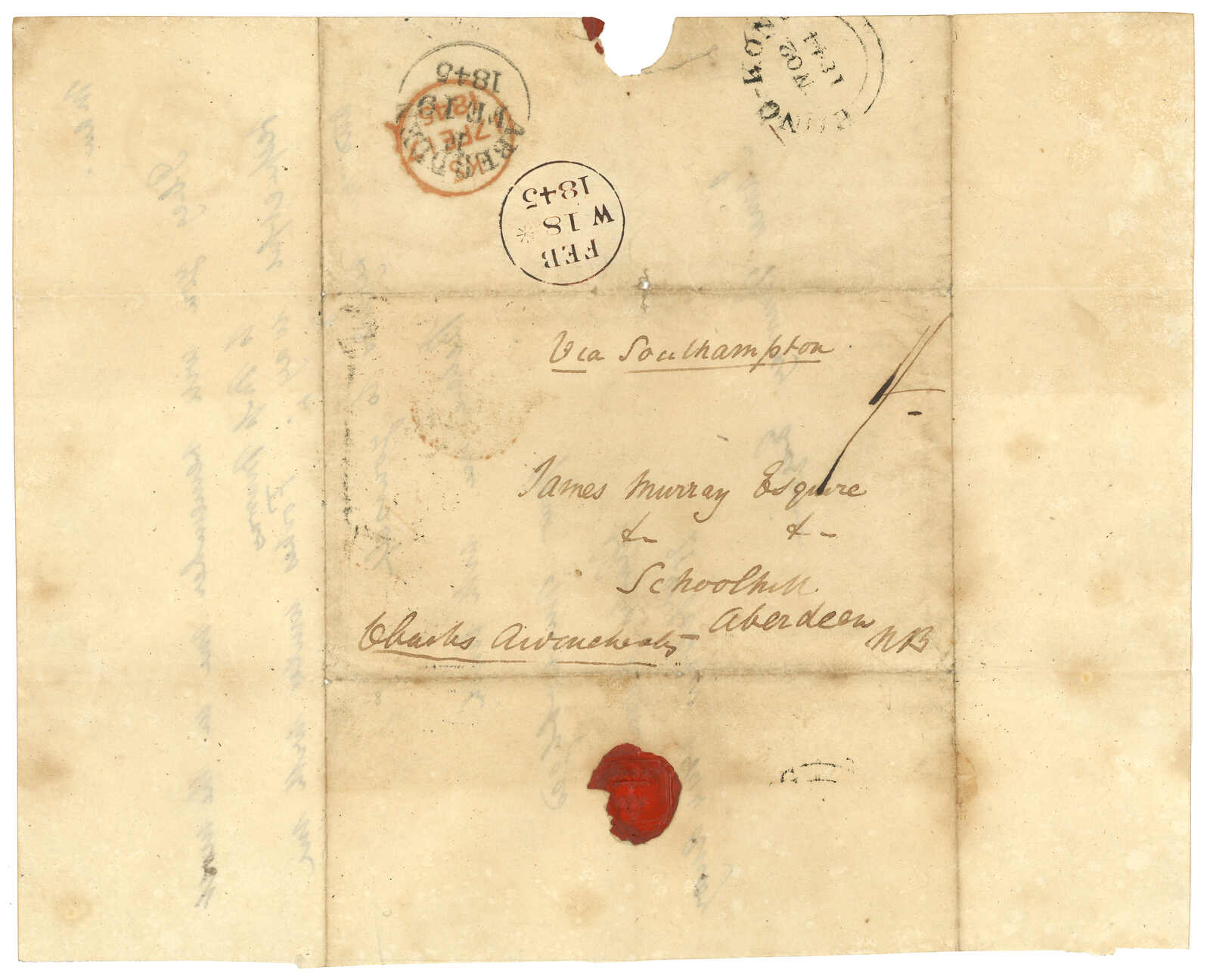 Arrived Aberdeen (19 Feb). Very little correspondence from Amoy before the arrival of the AMOY PAID cds have survived. Webb recorded only one dated 15 Mar 1846 which was also from the consulate to Scotland with same rate and Hong Kong transit cds.