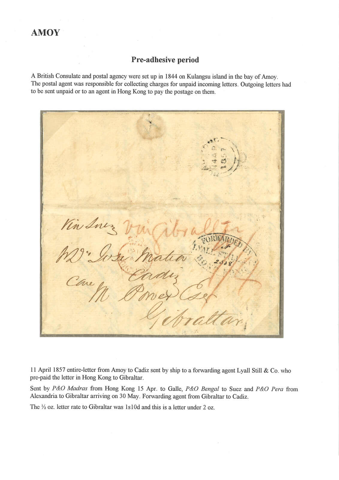 1857.4.11 廈門經直布羅陀郵政代理Michael