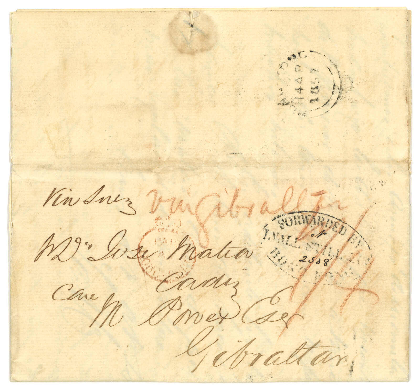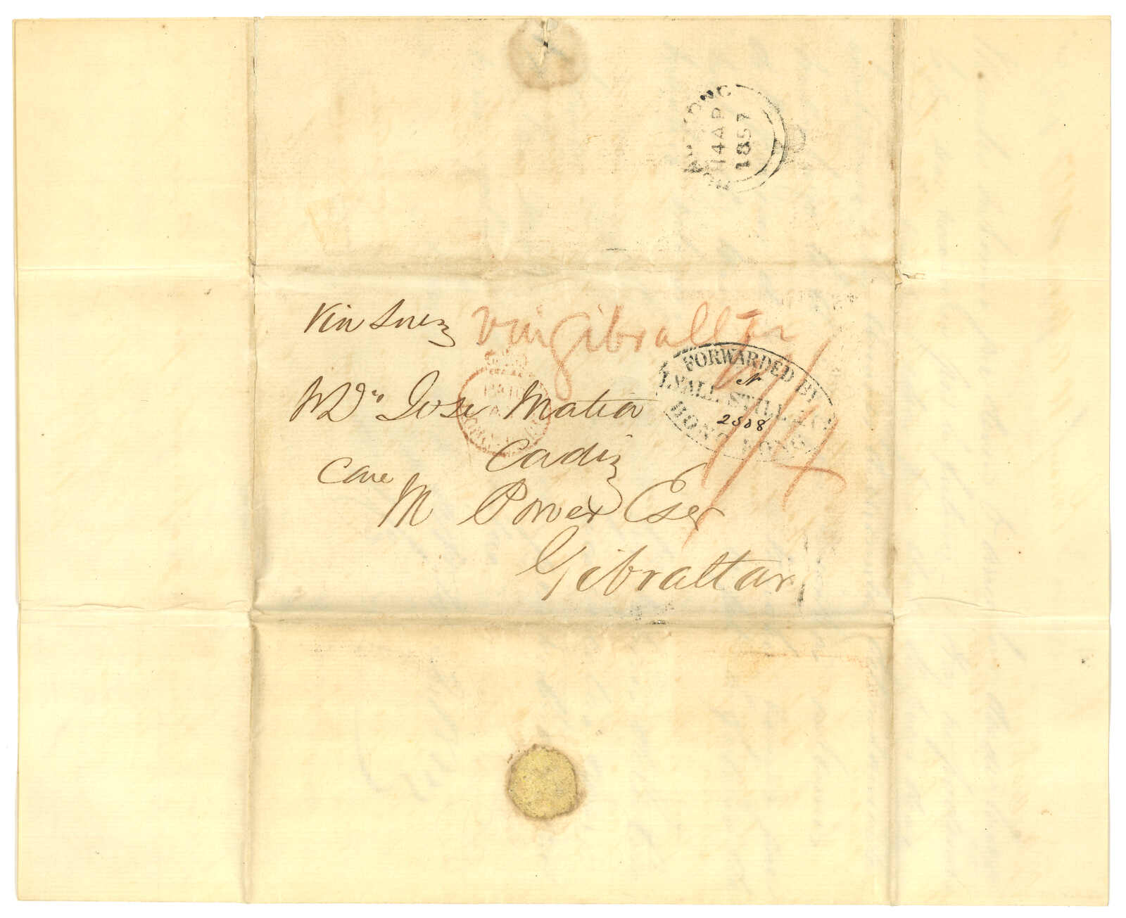 1857 Amoy (11 Apr) to Jose Matia in Cadiz via forwading agent Michael Power in Gibraltar. Entire letter, rated "1/4" and sent "via Suez", applied with Webb type 11 "PAID AT HONGKONG" circular h.s, Hong Kong double-arc transit