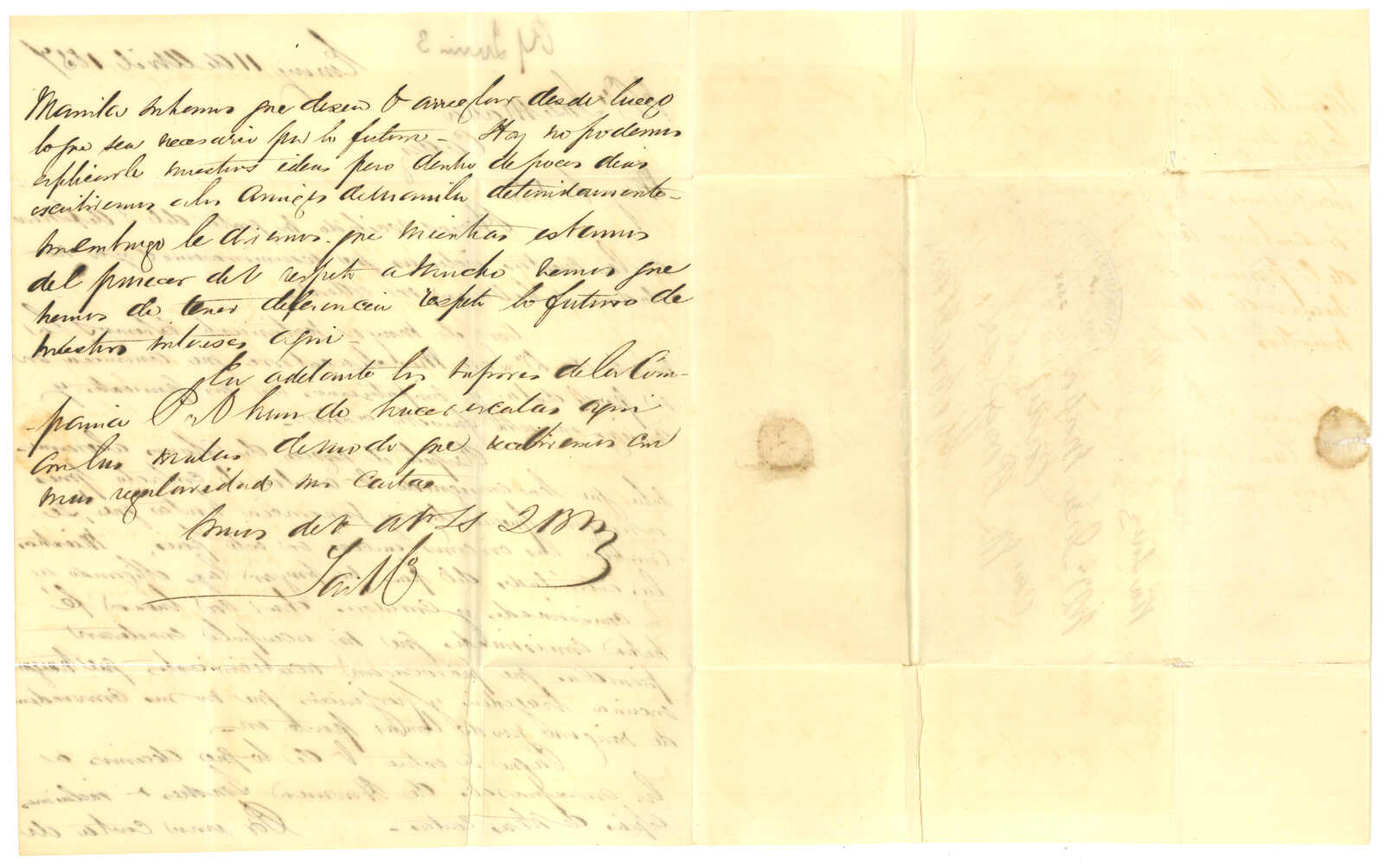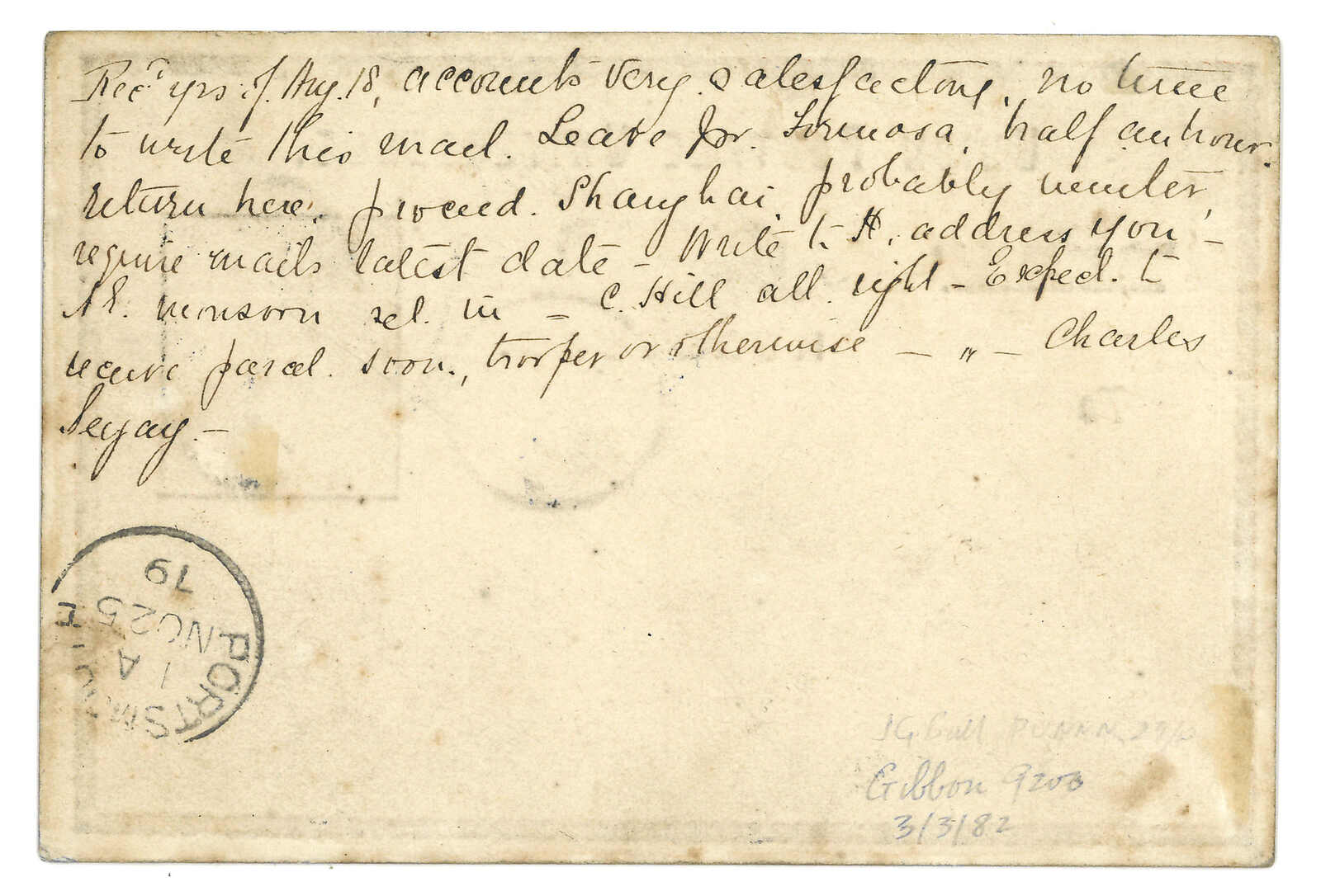 Power寄加的斯Jose Matia。郵簡,寫有“via Suez”及“1/4”郵資,鈐Webb 11型小皇冠“PAID AT HONGKONG”圓戳、香港雙弧中轉戳(4.14)及橢圓形轉運代理戳記。 Webb A型“AMOY PAID”日戳抵達前之廈門史前封十分稀罕少見。Webb記錄中僅見一件,日期為1846年3月15日,由領事館寄蘇格蘭。(Image 1)