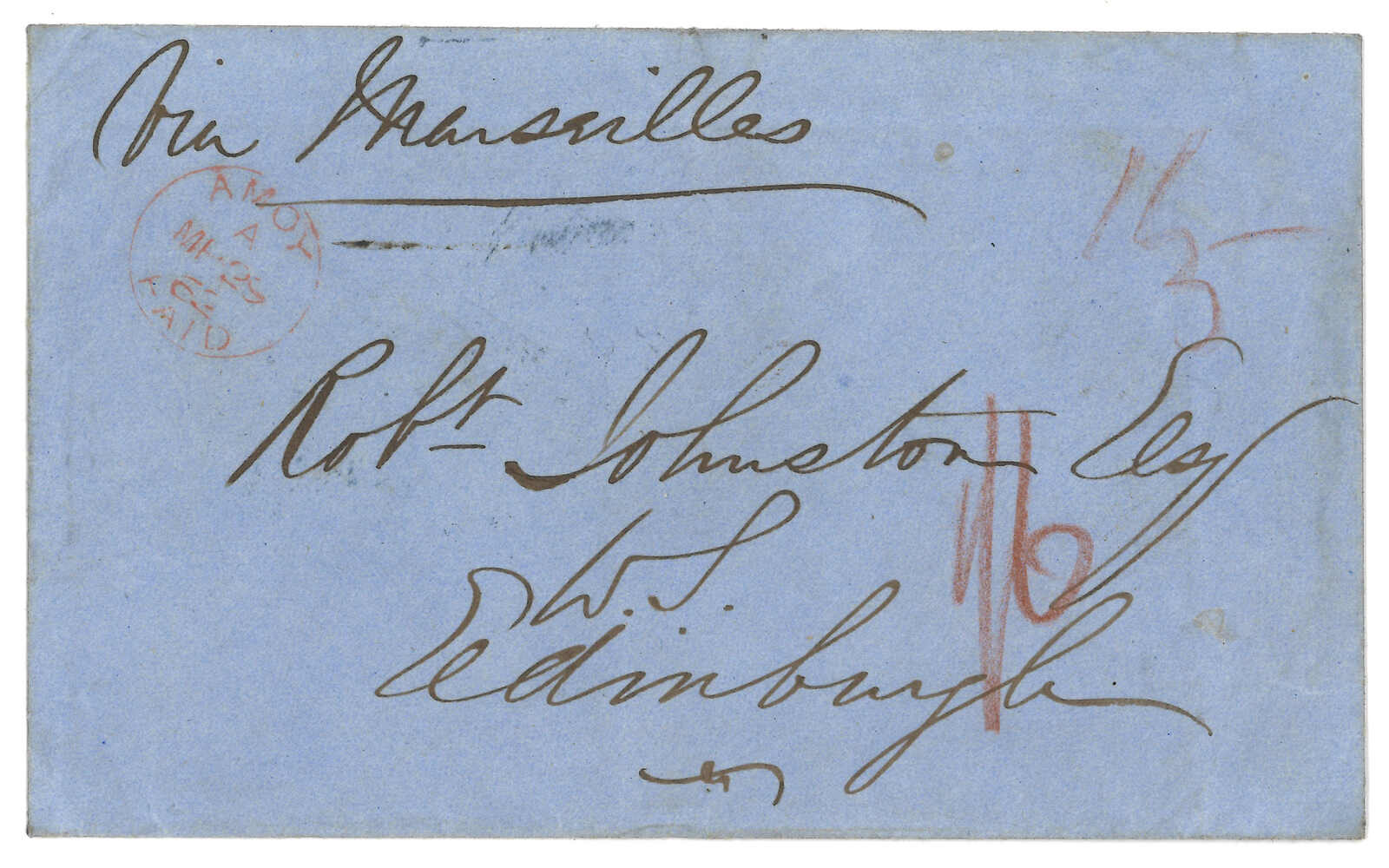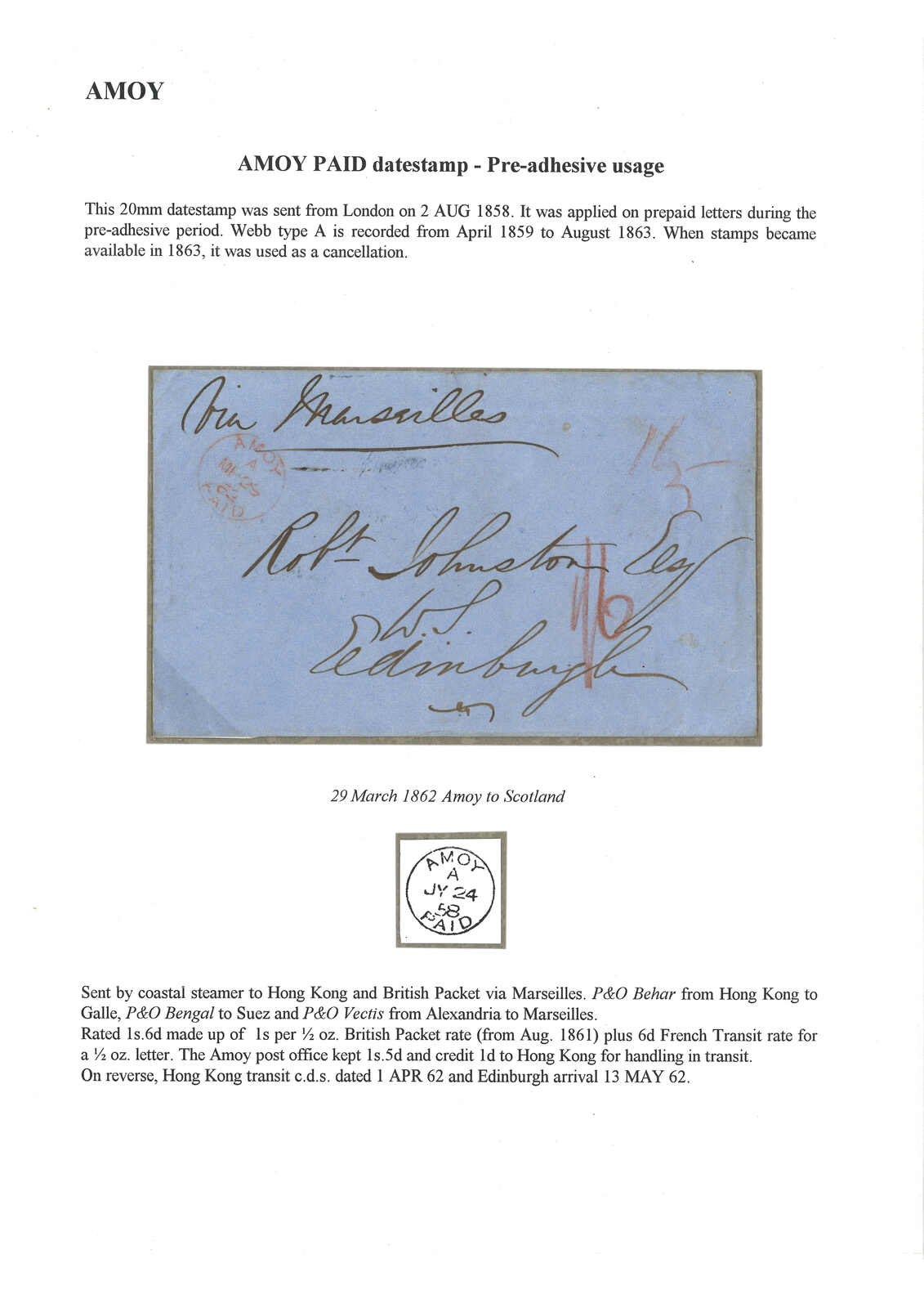 1862 Amoy (29 Mar) to Scotland, sent "via Marseilles" and rated "1/6", applied with Webb type A "AMOY PAID" cds in red. Transit Hong Kong (1 Apr). Arrived Edinburgh (13 May). Webb only recorded 8 pre-adhesive usage of this cds